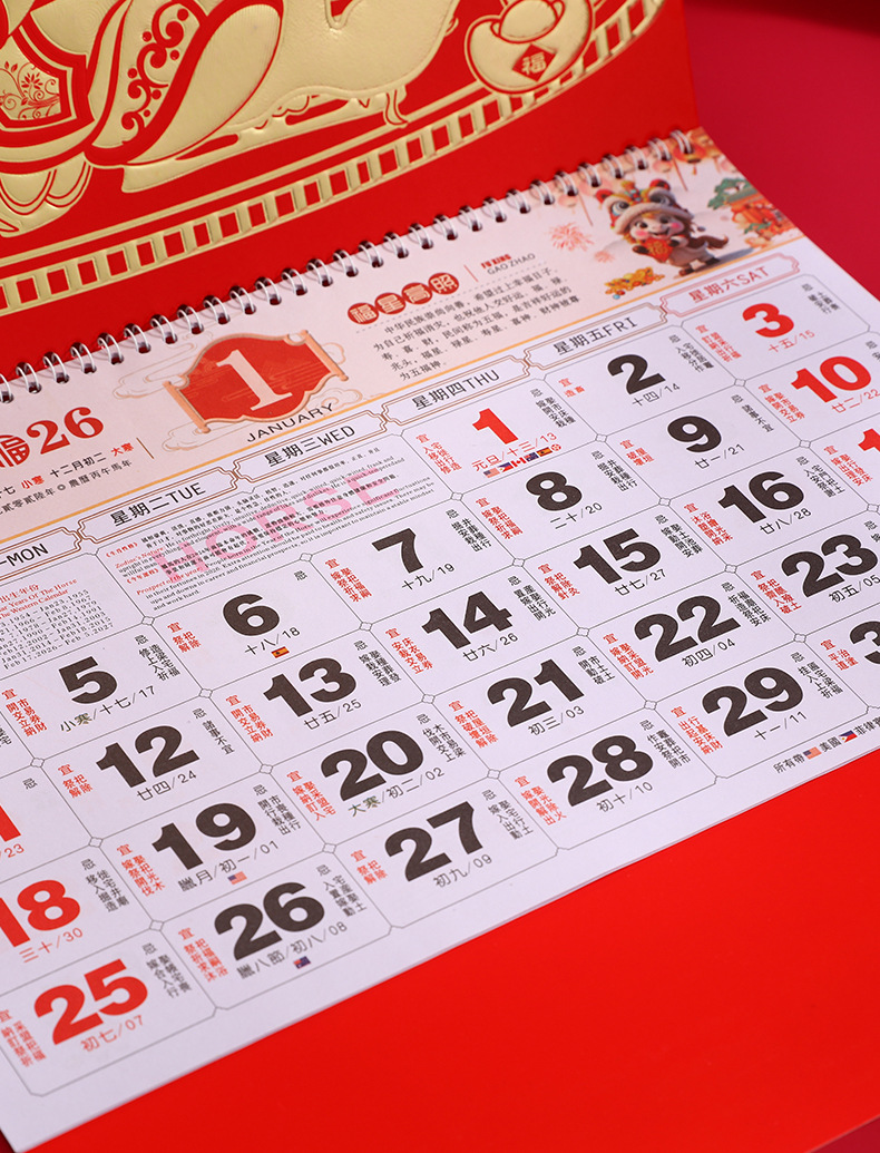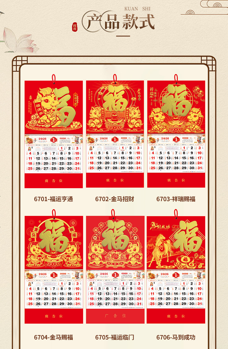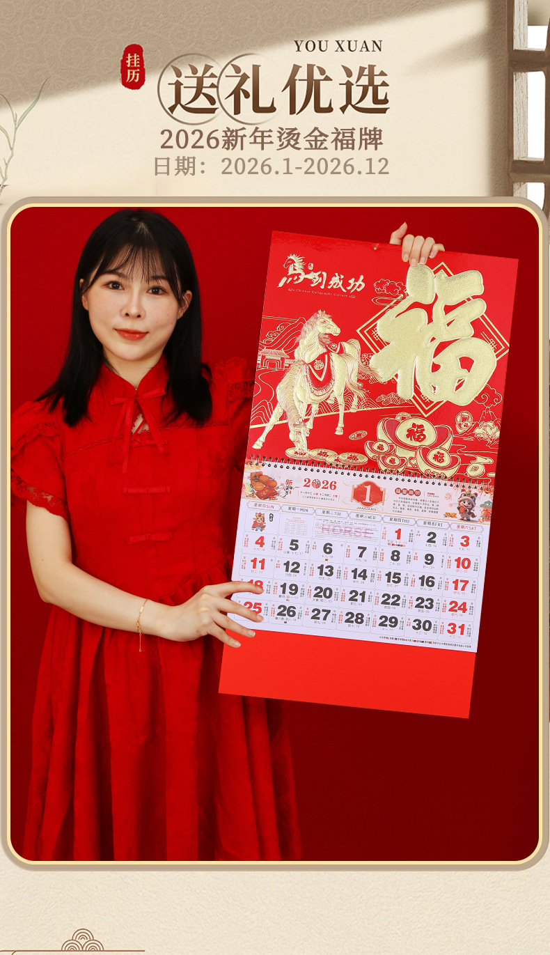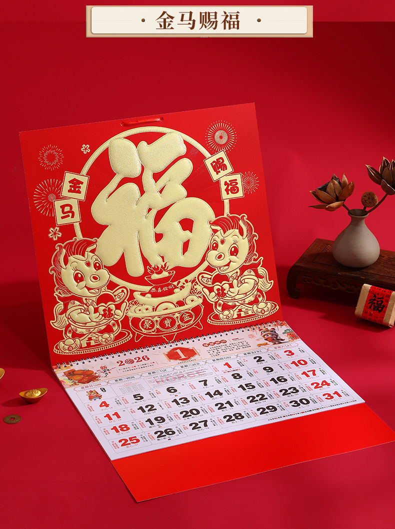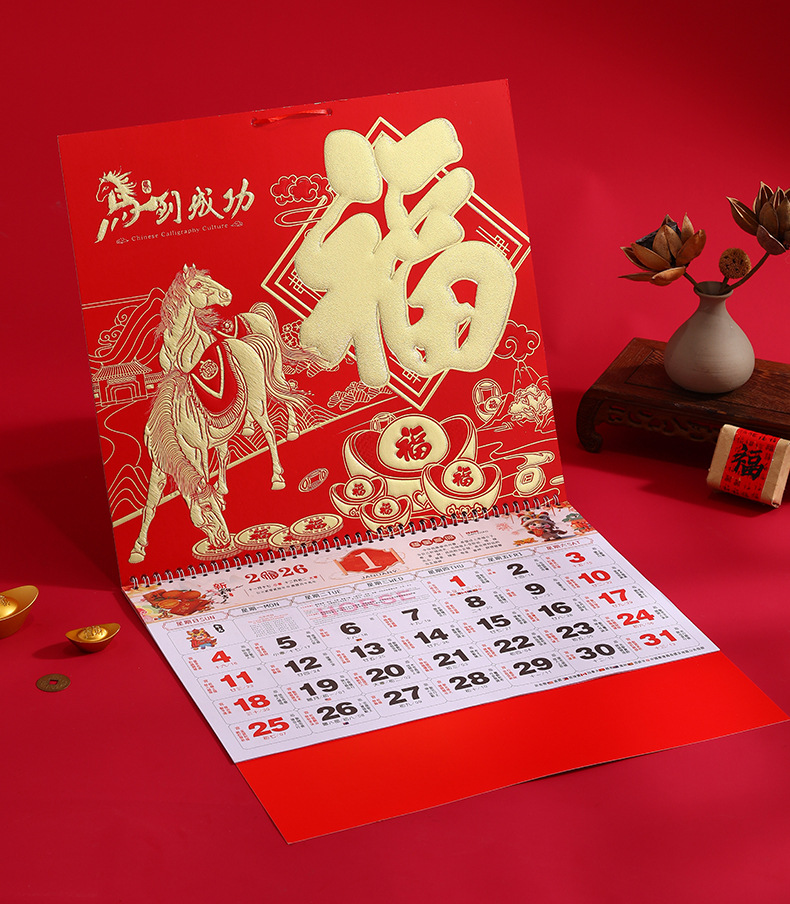 2026 Год Лошади Производитель Оптовая продажа Положительный шестираздельный золотой фольгированный ярлык Печатаемый рекламный горячий штампованный логотип Настенный календарь Настольный календарь