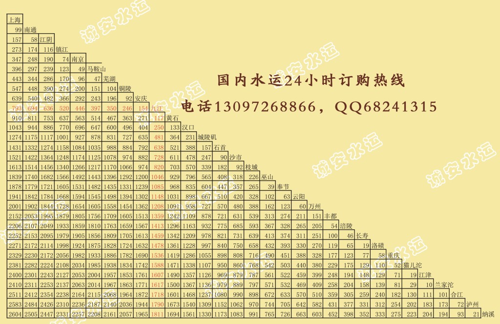 ⑶各内河支流停靠城市:东台、大丰、盐城、射阳、滨海、连云港、涟水、凤阳、盱眙、巢湖、合肥、南昌、丰城、都昌、鄱阳、万年、乐平、景德镇、汉川、常德、沅江、益阳、长沙、株洲、湘潭、衡阳等