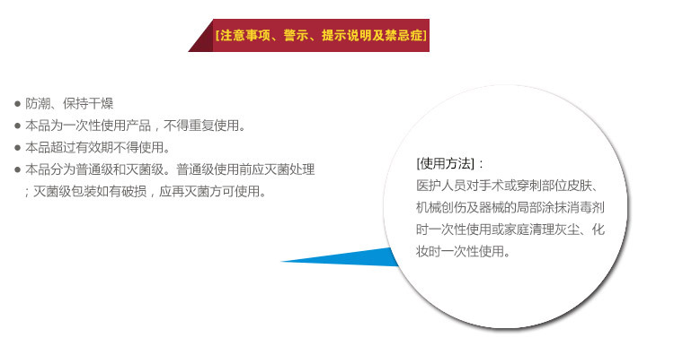 医护人员对手术或穿刺部位皮肤、机械创伤及器械的局部涂抹消毒剂时一次性使用或家庭清理灰尘、化妆时一次性使用。