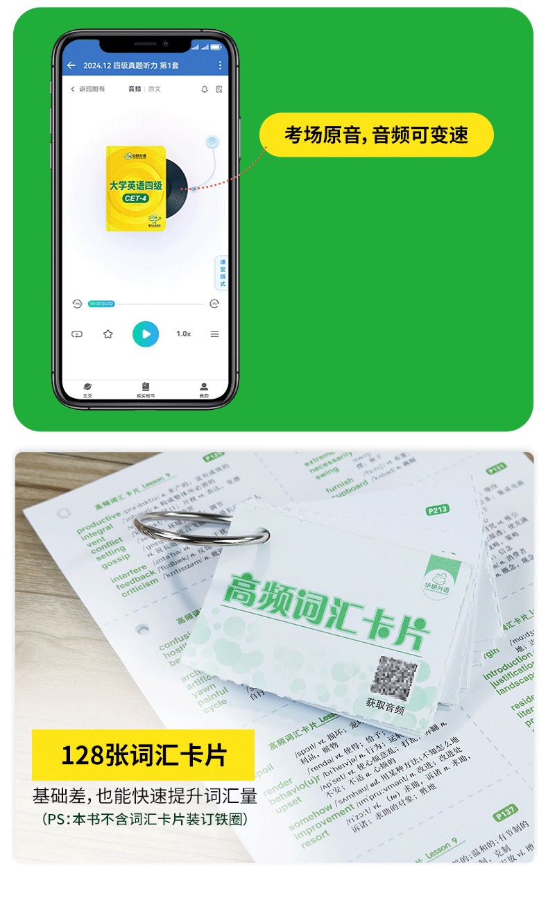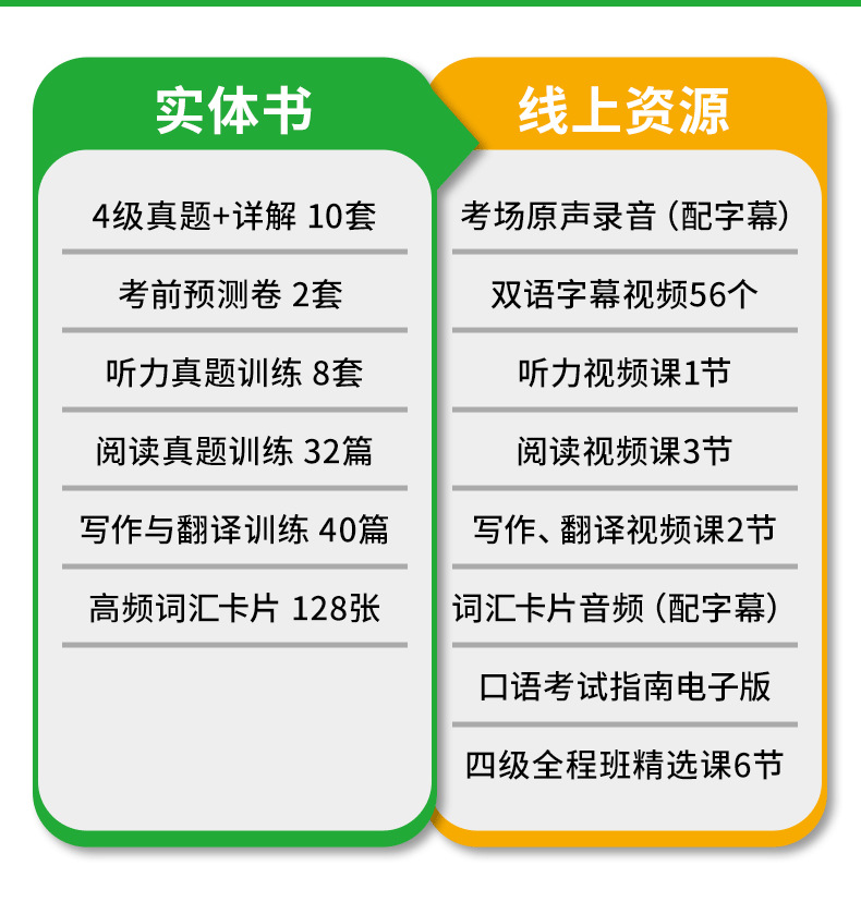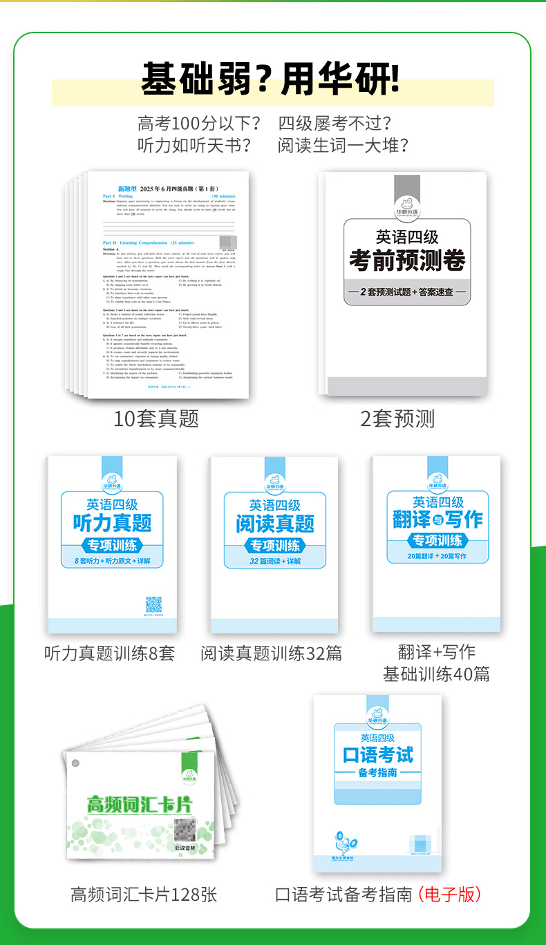 音频:英语四级真题试卷、预测试卷、词汇、四级口语样卷、听力真题专项训练分册(内文相应页码扫码获取)