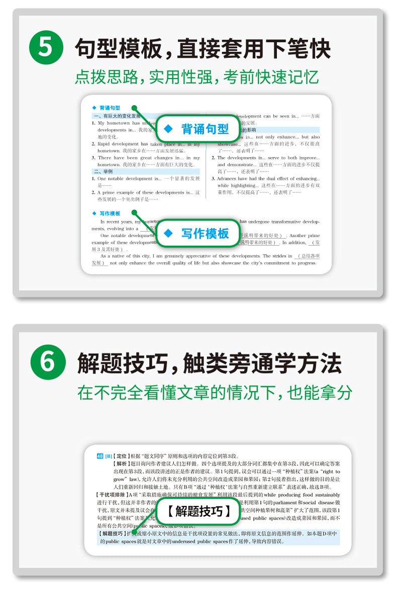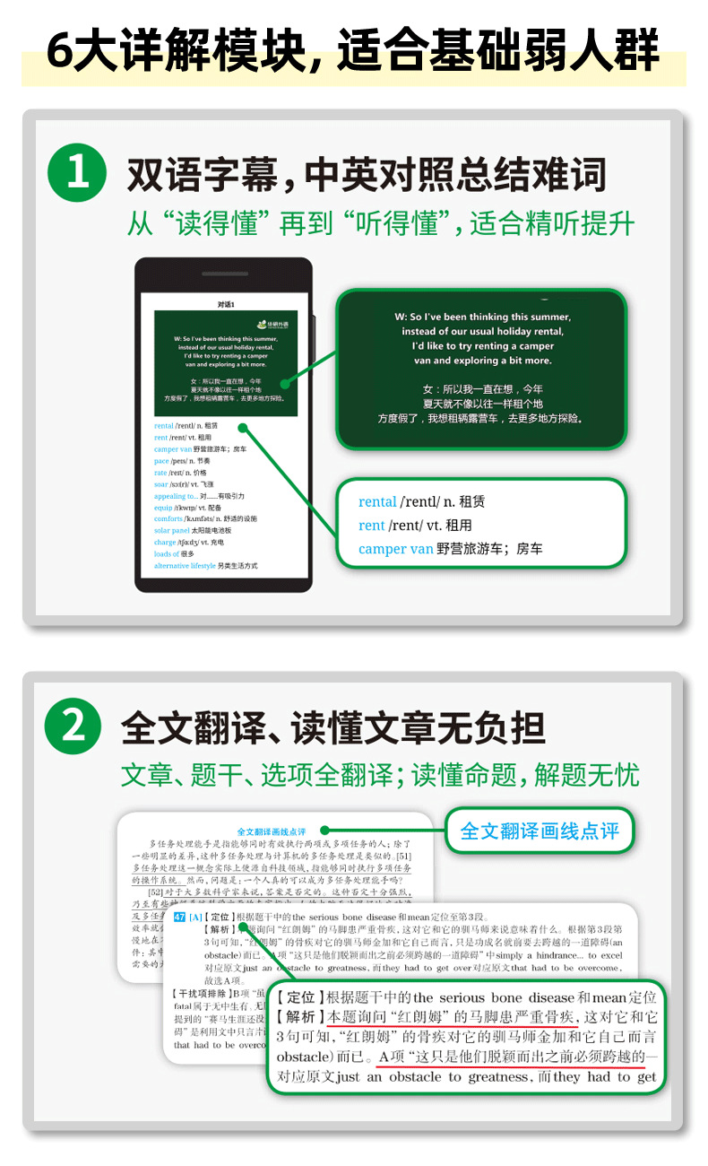 2. 解析6大详解模块,适合基础薄弱者使用:听力双语字幕、阅读全文翻译、词汇总结、写作翻译无生词、句型模板、解题技巧。