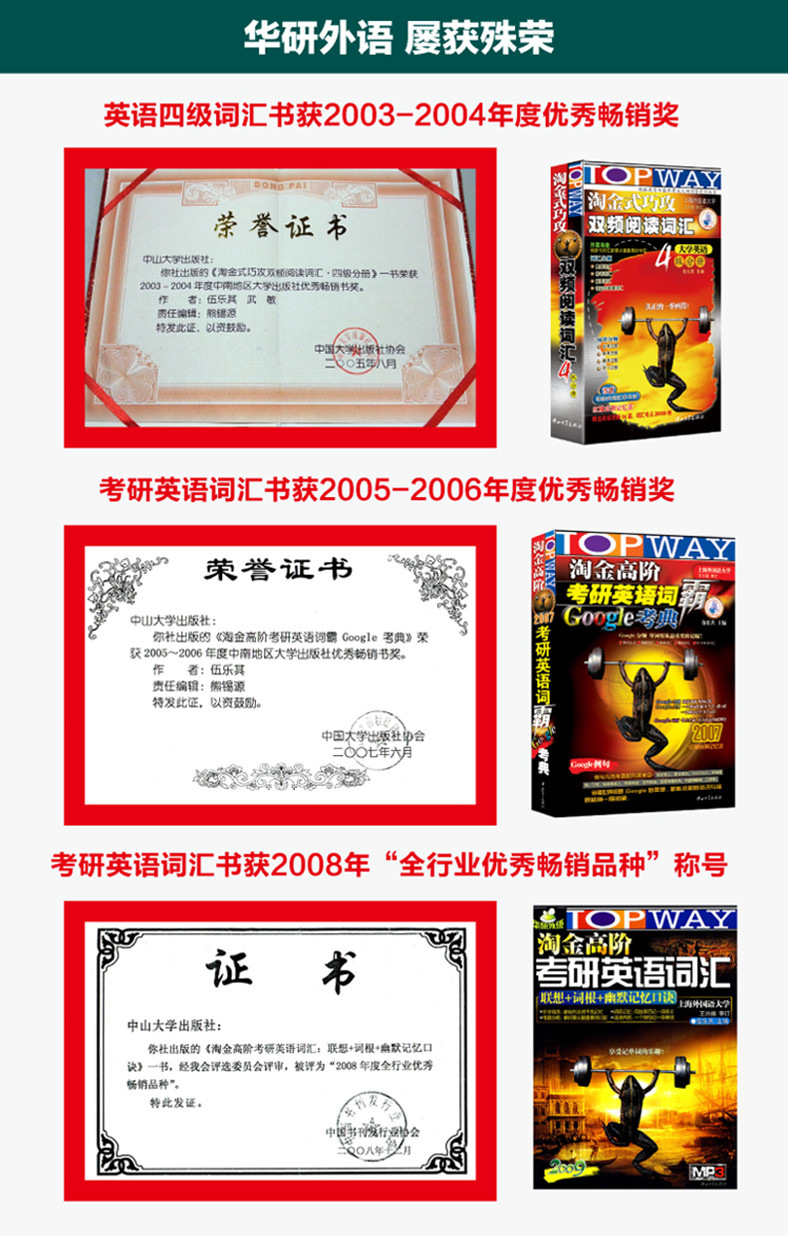 TOPWAY是华研的做事原则,经验表明,方法得当就会事半功倍,让您花更少的时间取得更好的学习效果;“沙里淘金”是华研的思维方式,通过语料库分析、词汇分频、难度分级等诸多科学手段,让您抓住,从而达问题的关键,用20%的精力取得80%的成效,体现“二八定律到“四两拨千斤”的效果。