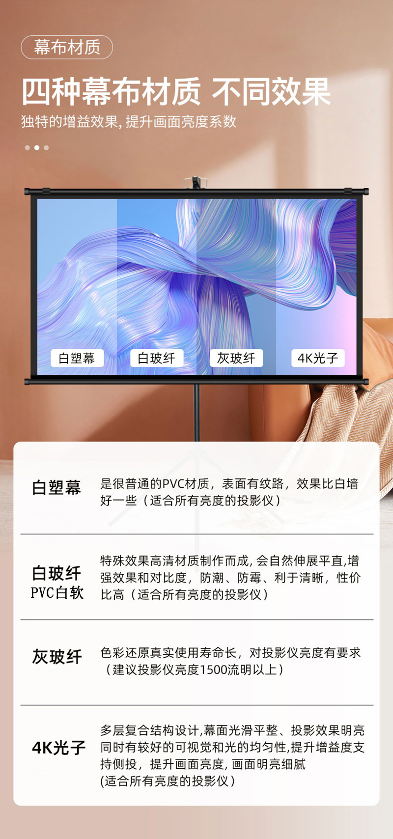 Портативная штора из белого пластика и стекловолокна 100/120 дюймов, против света