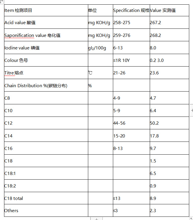 - 性状:本品在熔点以上为无色或者浅黄色透明液体,带有天然椰子油香味,白色或乳黄色固体蜡状或油状液体