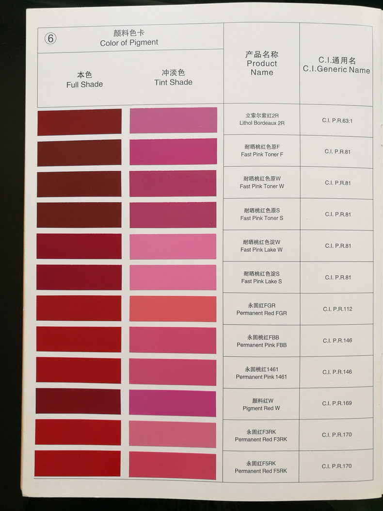 无机颜料和有机颜料,其中包括酞菁蓝B、酞菁蓝BGS、酞菁绿G、耐晒大红BBN/BBM、立索尔大红、立索尔宝红、金光红C、永固红F3RK\F5RK、3132大红粉、联苯胺黄G/10G、永固黄2GS、永固桔黄、永固紫、炭黑、群青、中铬黄、柠檬黄等各种颜料(由于品种太多,在此不一一列举)。