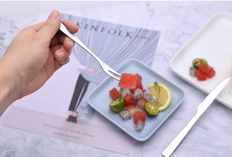 Оптовая продажа вилок из нержавеющей стали, высококачественная вилка с двумя зубцами, вилка для фруктов, тортов, можно напечатать логотип