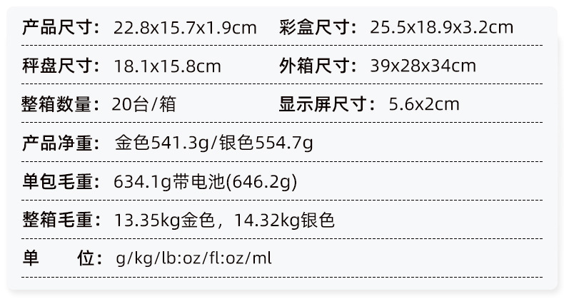 支持单位:g/kg/lb:oz/fl:oz/ml