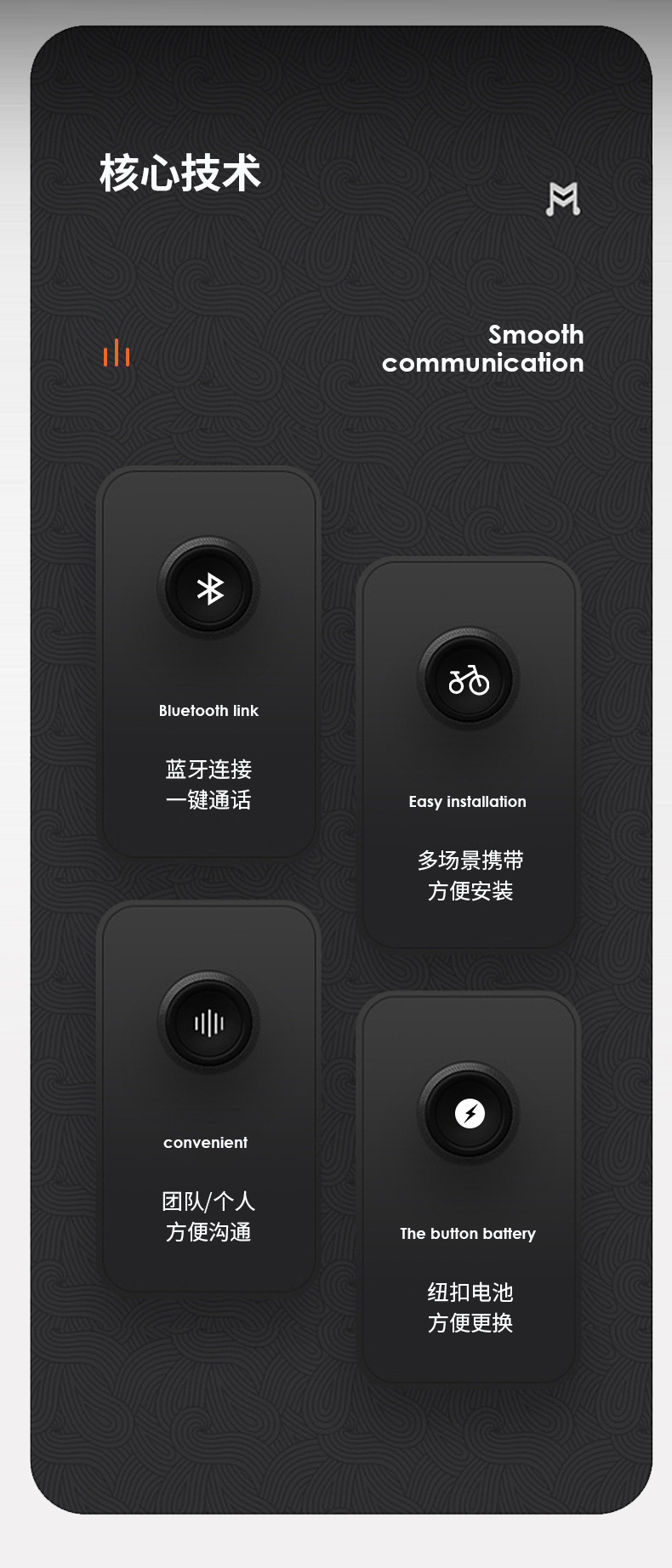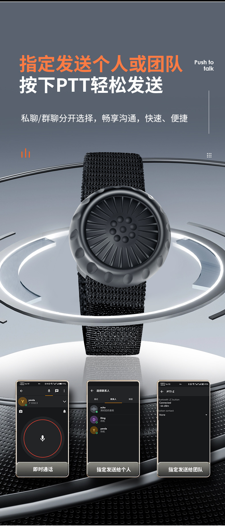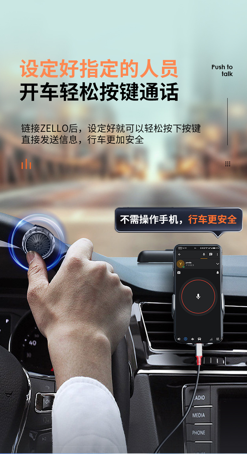 PTT按键与Zello连接后,小小的PTT按键可以代替在手机上点击发送语音的动作,将所有语音发送的动作由这个小小的按键代替,只需要开启蓝牙就可以链接,如果搭配上耳机,操作就更加的方便,这些都会让您的产品体验更加的丰富。