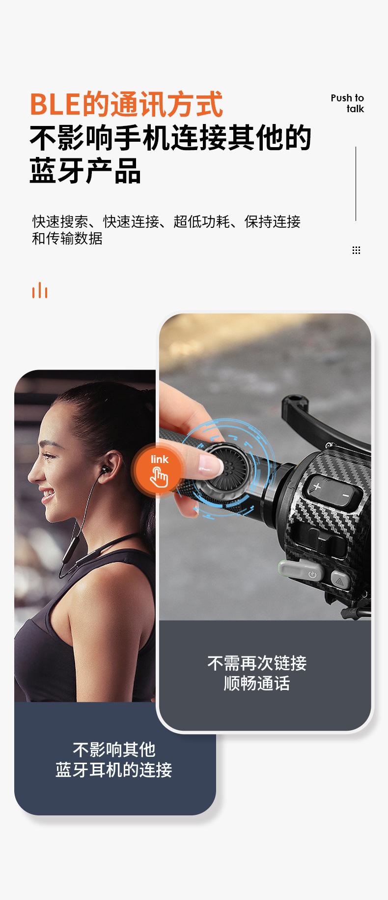 在骑行过程中,会因为距离蓝牙信号不好导致通讯受阻,会因为对讲人数的影响团队出行、更会因为需要操作对讲按键影响行驶安全,当PTT按键与ZELLO对讲软件搭配后,这些问题都可以解决,连接后轻松按住就可以传输语音,不限距离,不不限人数.