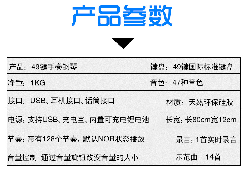 ·外观新颖,可卷携带方便,易清洁,易携带,易保养。作为可以移动的钢琴键盘,在钢琴不在身边的时候可以练练指法,学声乐的朋友也可以用来练视唱练耳,喜欢丰富业余生活的朋友可以用来娱乐.卷钢琴可以用来做新年礼品,圣诞节礼品,复活节礼品,春节礼品,情人节礼品,儿童节礼品,万圣节礼品,或生日礼品等,为您'创造美好生活'。