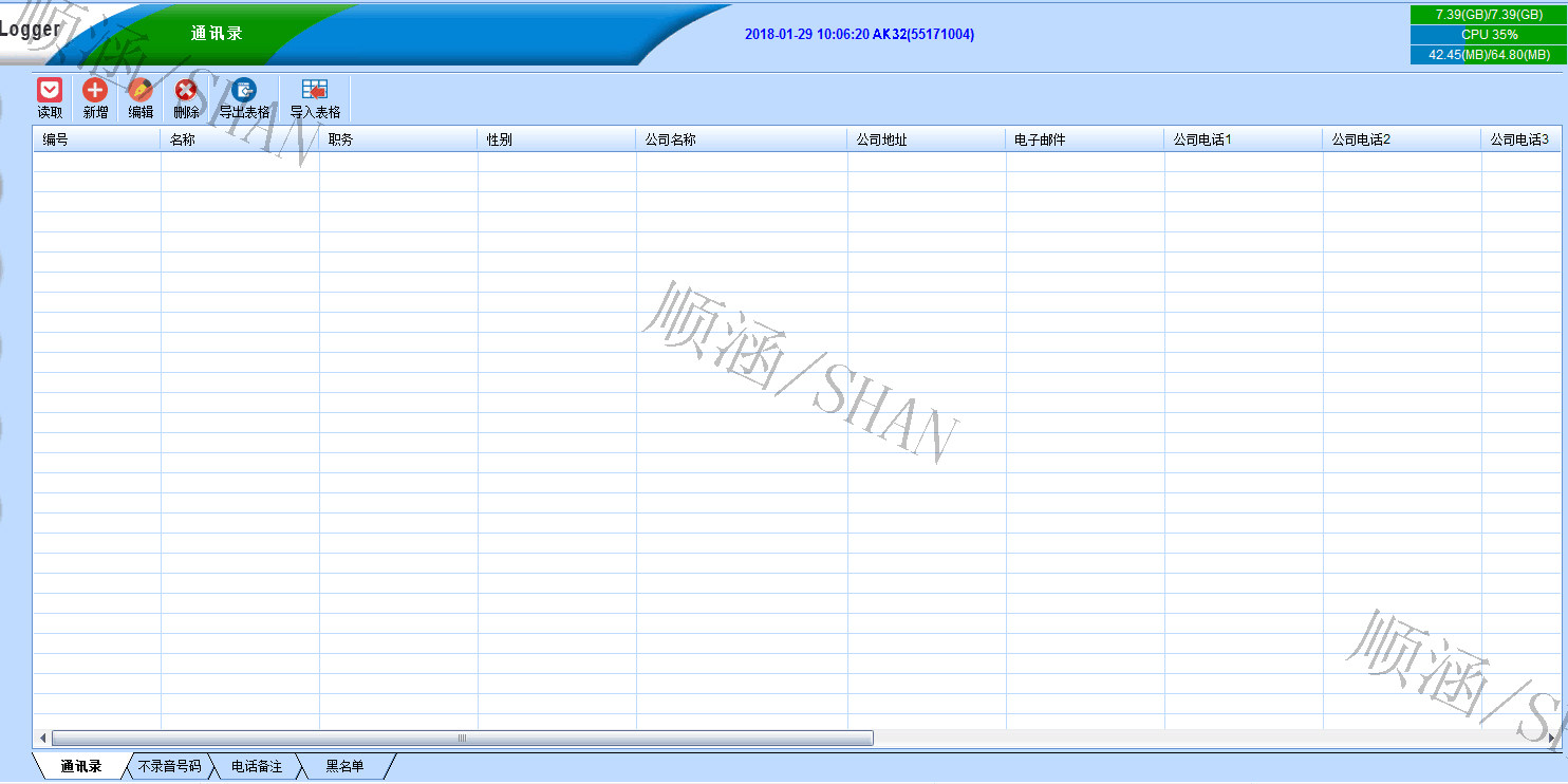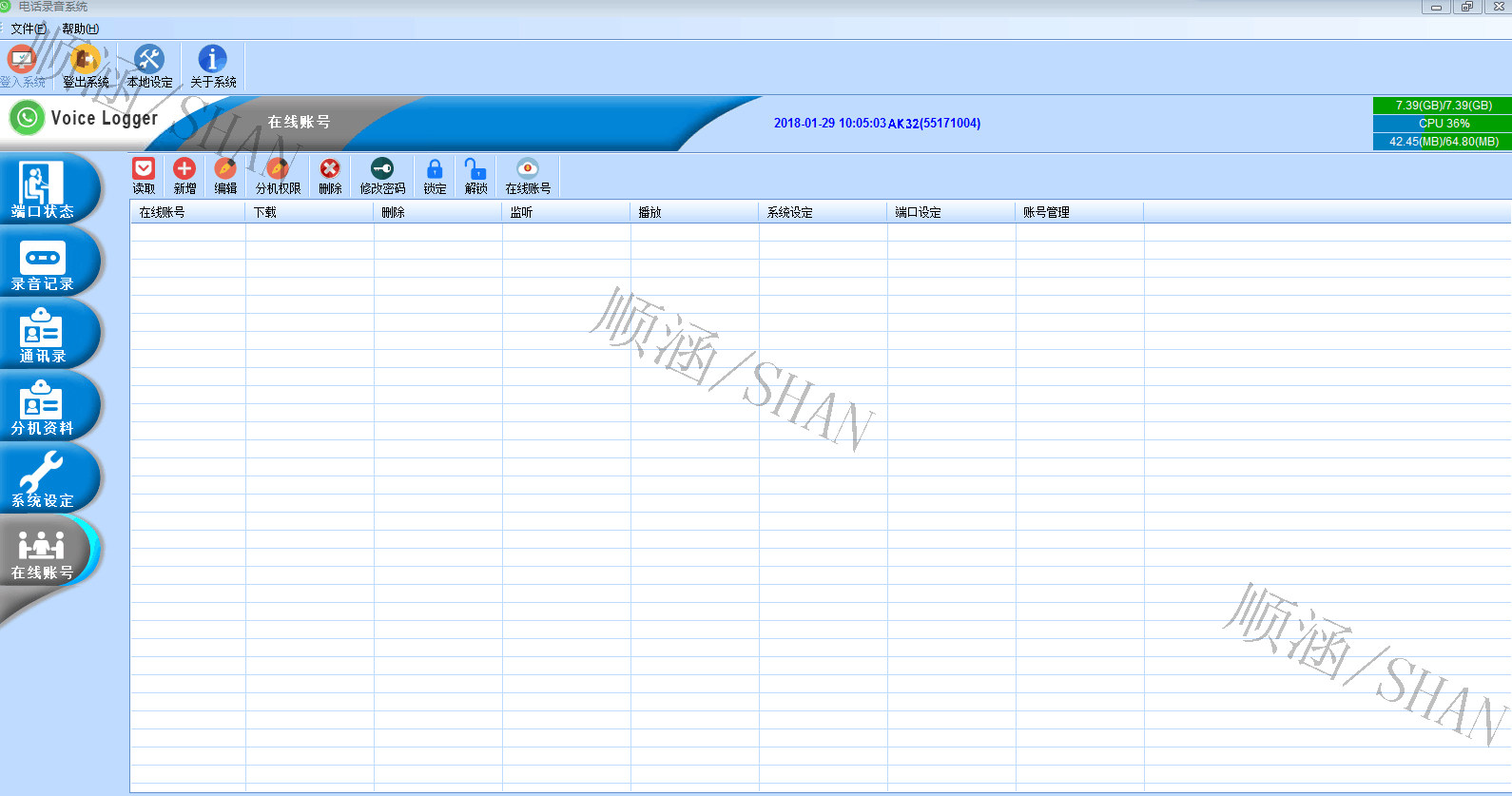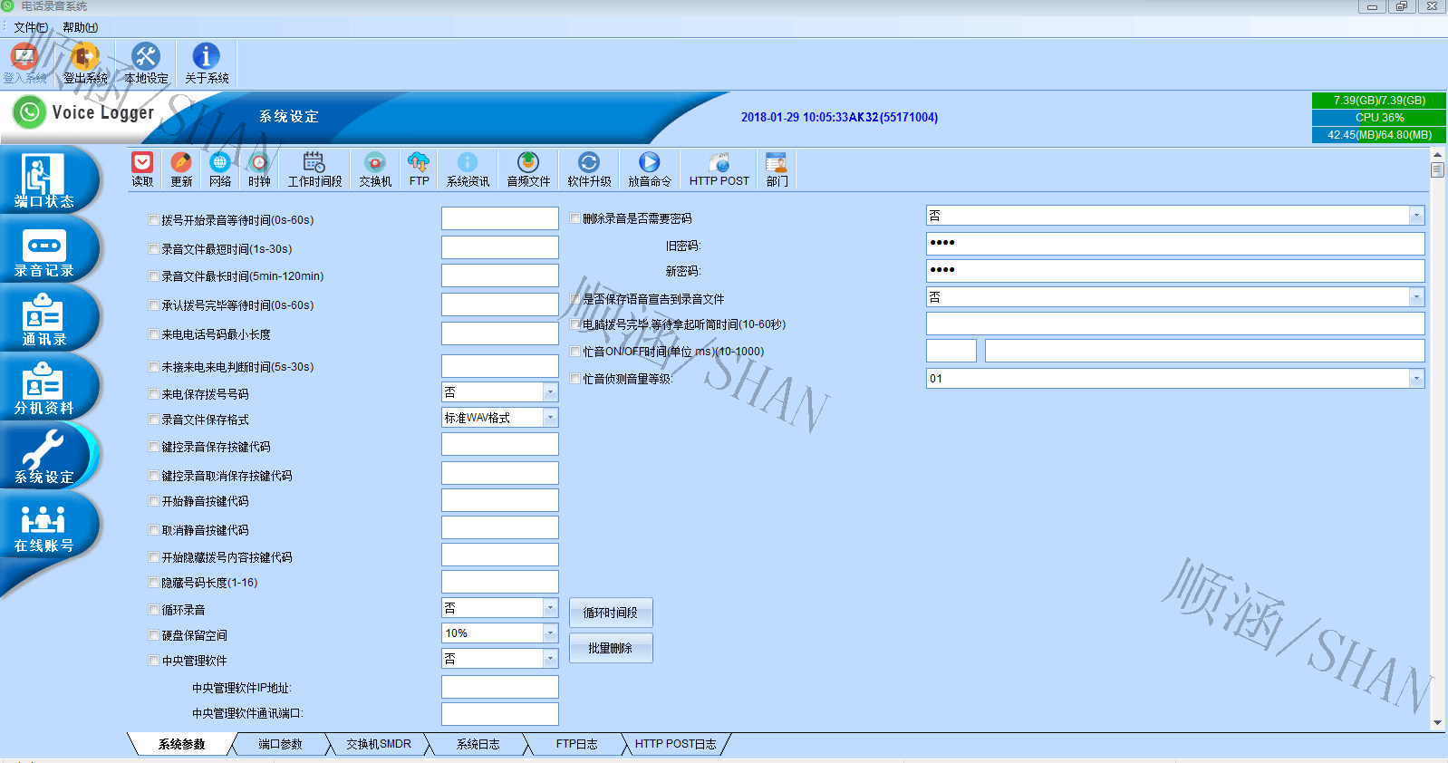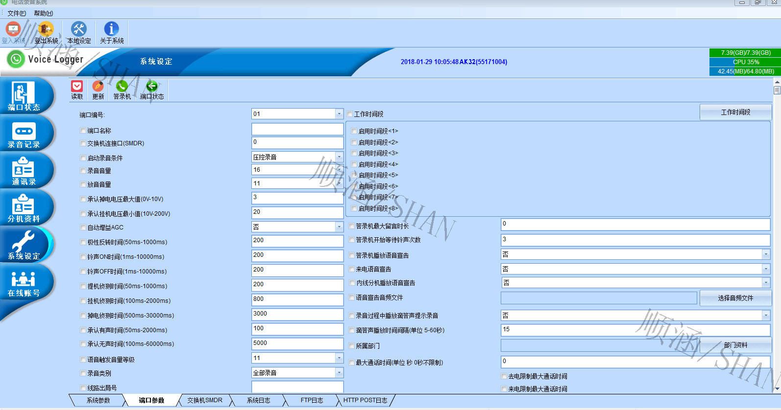 系统容量以8个电话端口为一个单位,可以用电话卡来随时扩充,多可装4片卡,同时录32线,储存媒体是一部可抽取的1T硬碟。可以录7万小时的对话,并在硬碟满了之后循环录音。