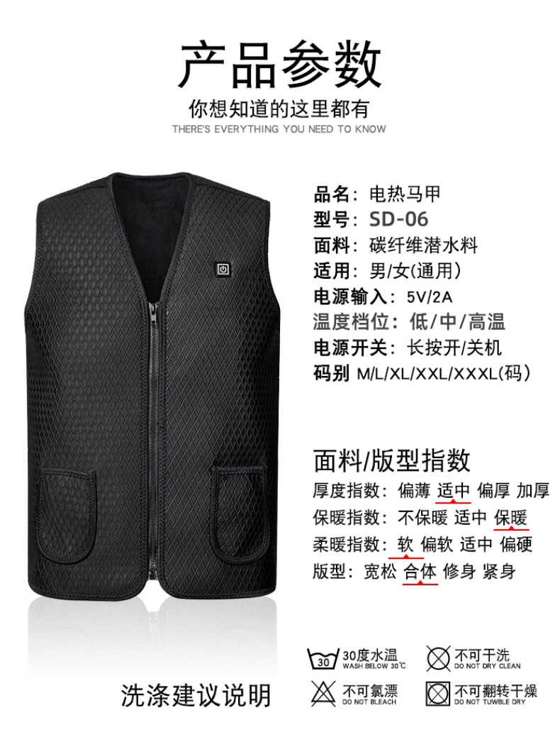2、建议用温水手洗,泡水前请拨掉电源,清洗晾干后再穿着,清洗时不要大力揉搓电线和发热丝部位。切记电源插头内一定不能存有水分。