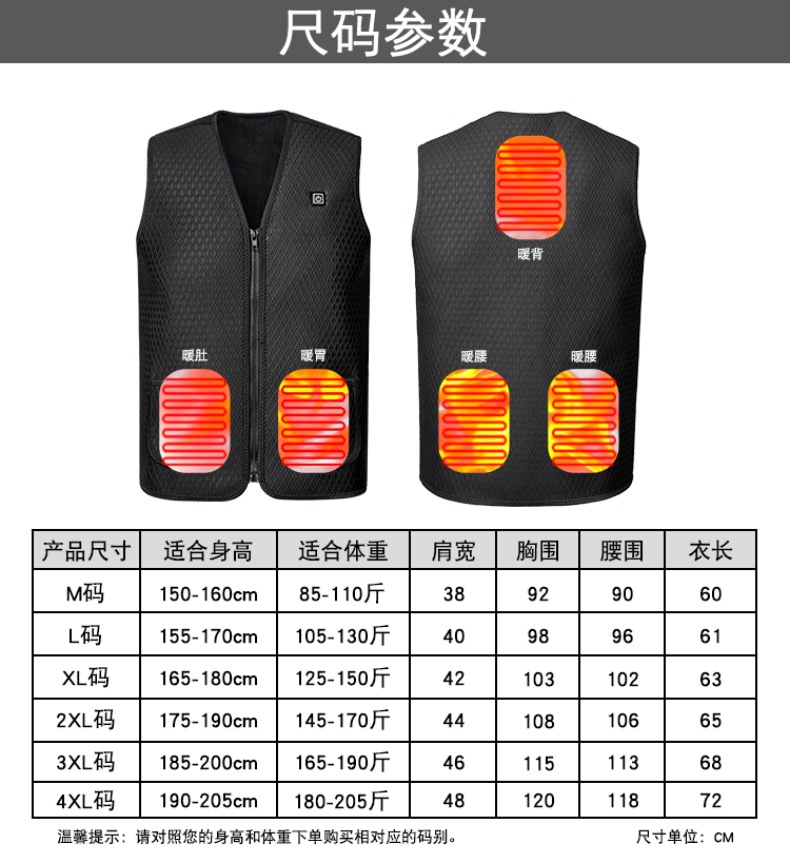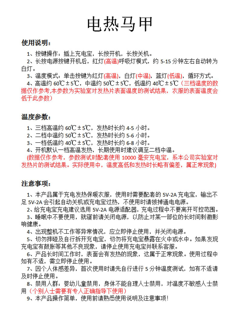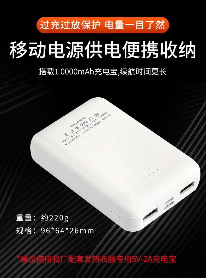 1、电热马甲和充电宝是分开售卖,建议配套使用我厂生产的电热衣服专用5V-2A充电宝。