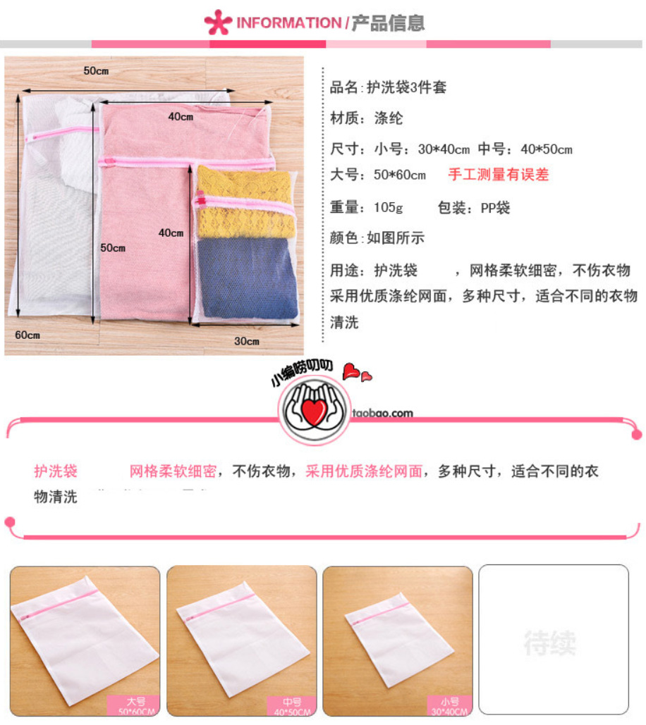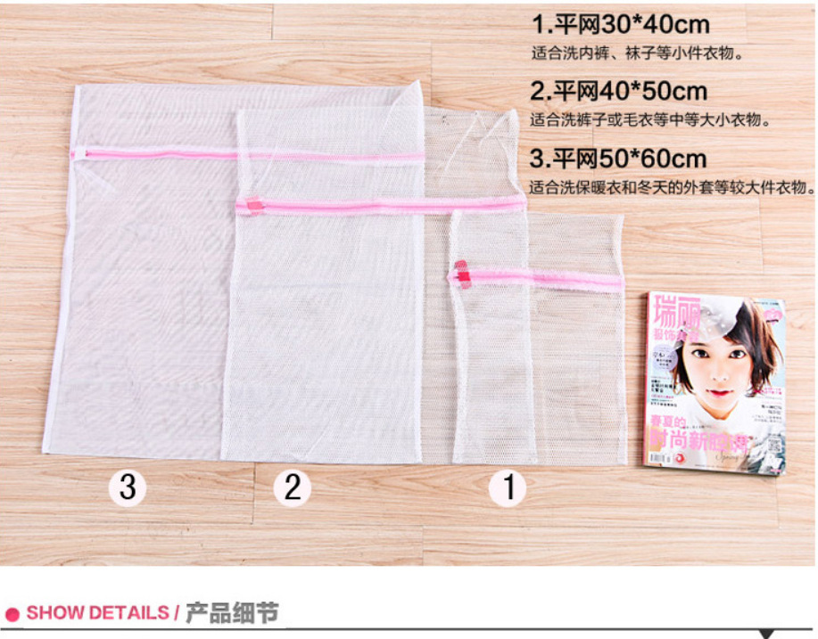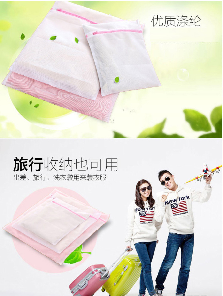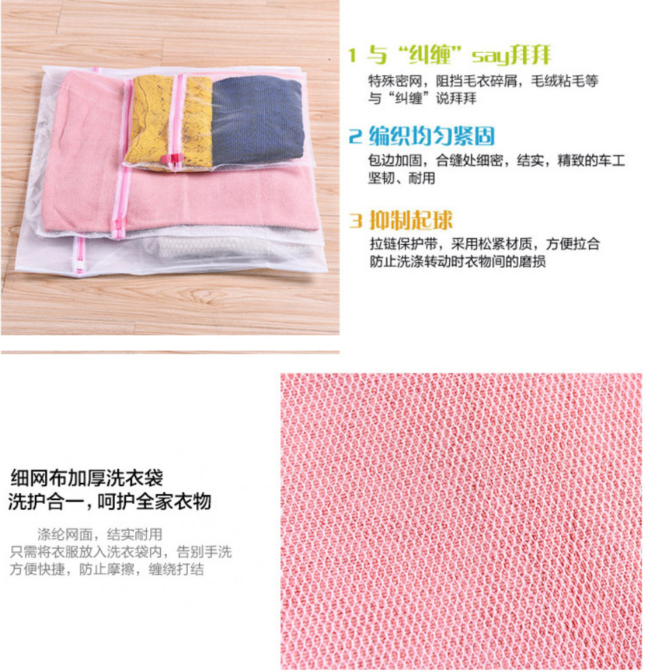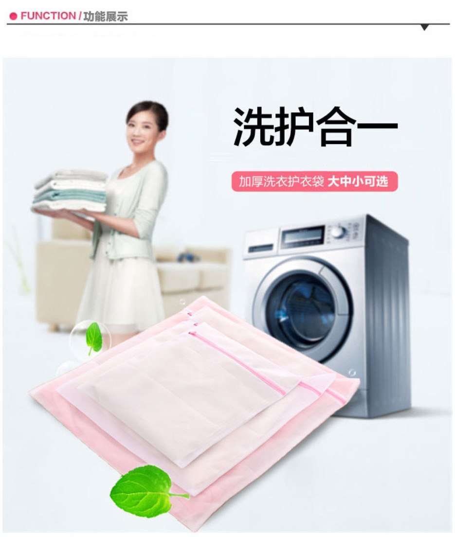 可避免洗衣机洗衣时衣物缝合处开线或掉扣子,并减少对洗衣机的磨损,有效保护衣物避免因强力洗涤时衣物缠绕,扭曲导致衣物变形而且不影响洗涤效果;使用方便、简单,适用于全自动洗衣机、半自动洗衣机、脱水机、烘干机的洗涤过程使用。