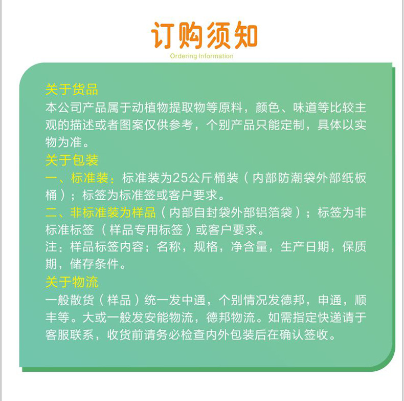【包 装】:协商或内用双层塑料袋,1公斤铝箔袋,25公斤纸板桶。