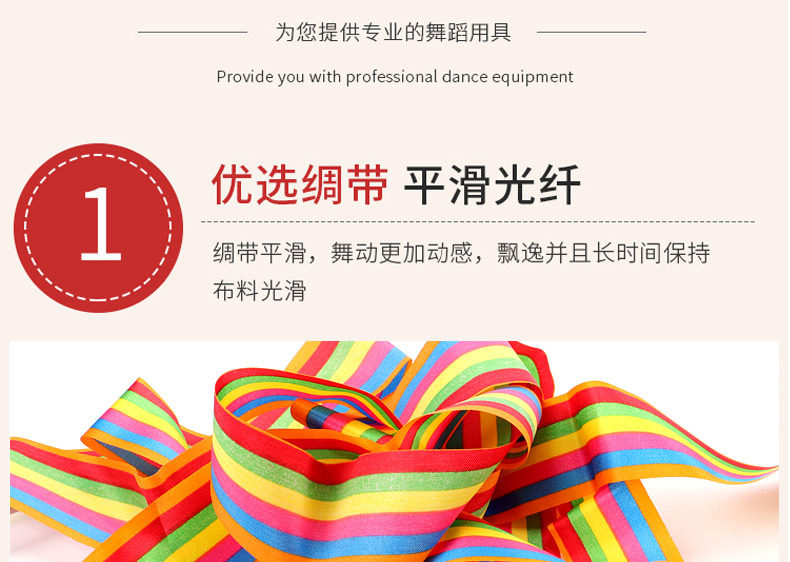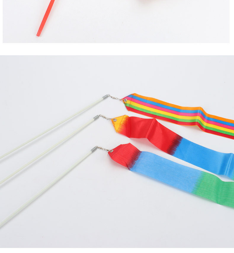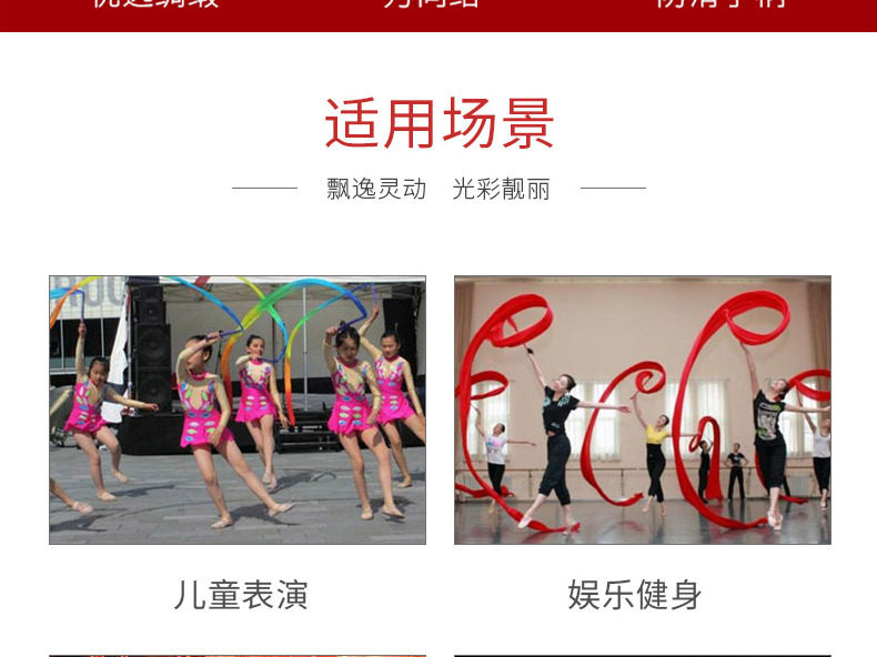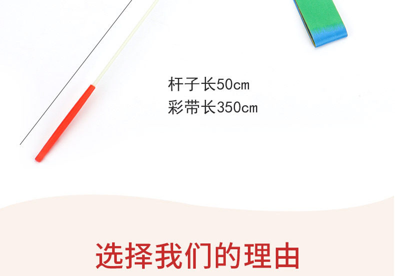 【材料】:标准专业艺术体操彩带,面料采用新材料丝绸面料制作, 手棒采用玻璃纤维钢制作,手握带防滑设计。