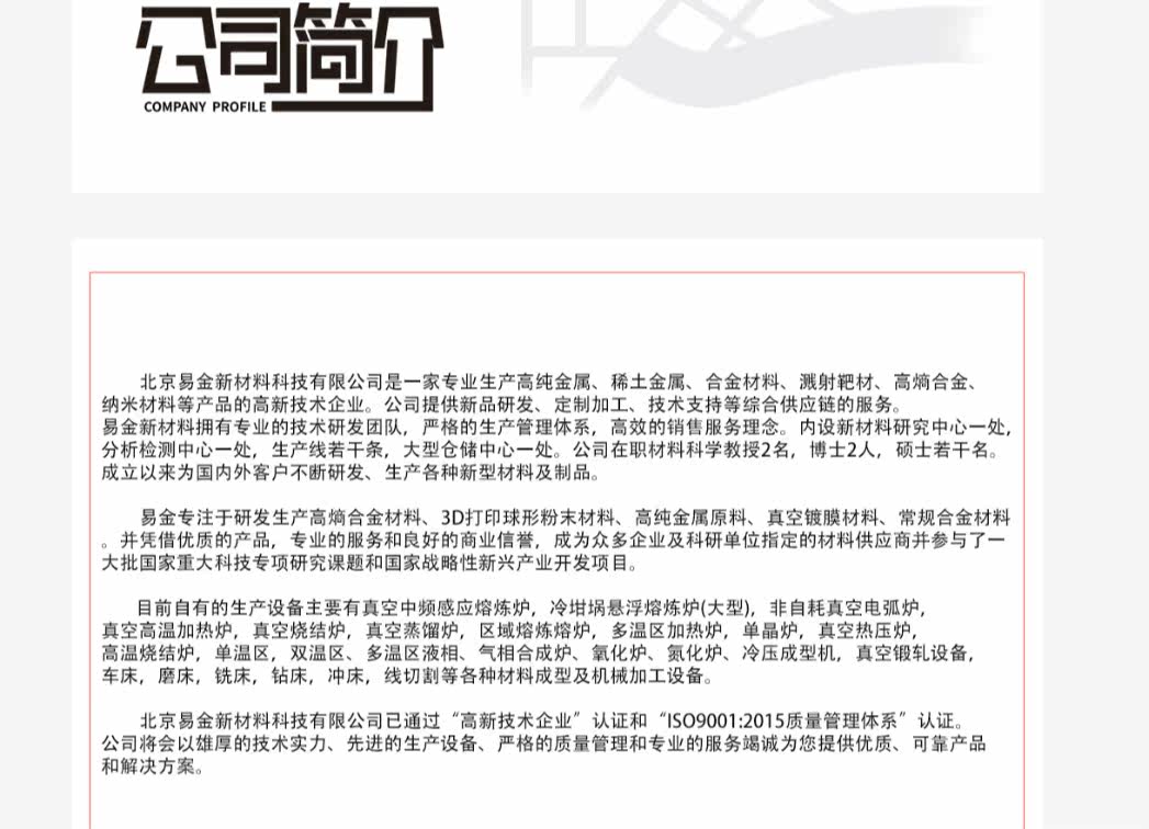 以下为北京易金新材料科技有限公司提供的常规新材料粉末:纯度、尺寸、规格、成分均可按客户要求加工定制。 | |