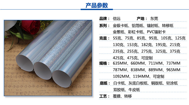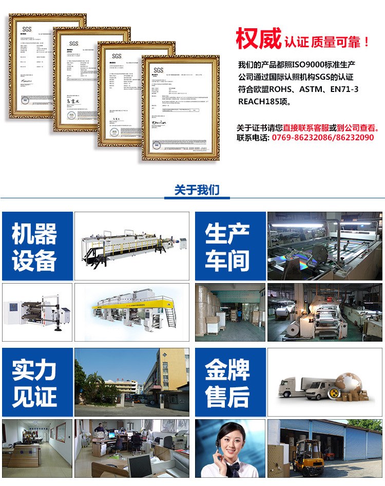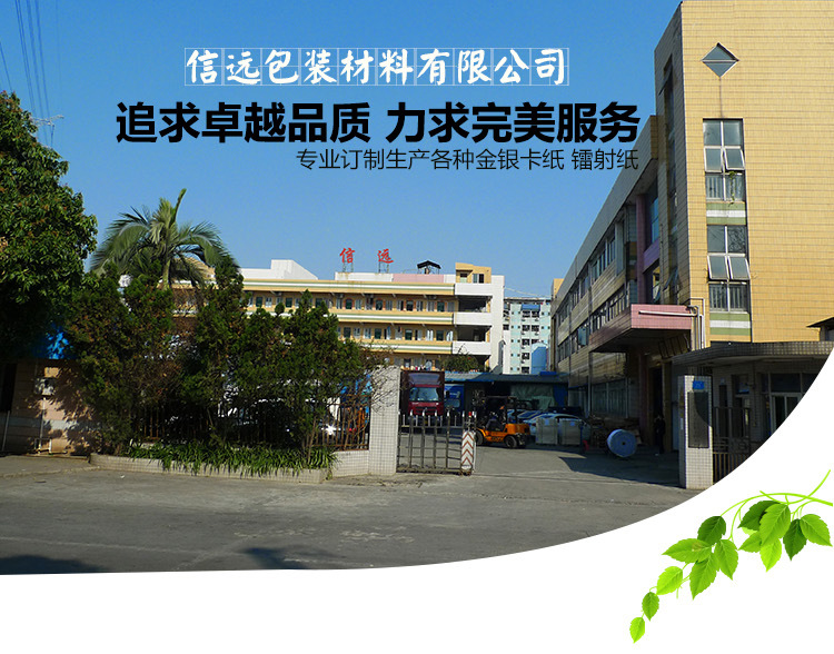 东莞市信远包装材料有限公司是东莞最早生产金银卡纸和镭射卡纸,铝箔纸,不干胶标签材料,PVC等塑胶复合材料的企业,具有多年的专业生产经验。拥有很强的研发实力,我司现有复合设备叁台,不干胶涂步机设备一台,电脑分切机叁台,电脑复卷分条机一台,我们所有产品都照ISO9000标准生产,所有产品已通过国际认照机构SGS的认证,符合欧盟ROHS、ASTM、EN71-3、REACH185项,16P等要求。我们紧跟包装材料技术前沿,不断创新来满足客户的各种需要。我们本着“质量是企业的生命,服务是企业的灵魂”的理念,不断追求超跃客户的期待是我们信远人的理想。