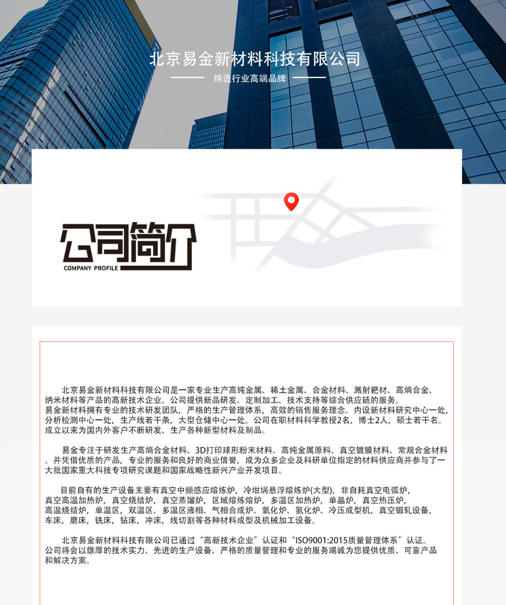 北京易金新材料科技有限公司已通过“高新技术企业”认证和“ISO9001:2015质量管理体系”认证。公司将会以雄厚的技术实力、先进的生产设备、严格的质量管理和专业的服务竭诚为您提供优质、可靠产品和解决方案。