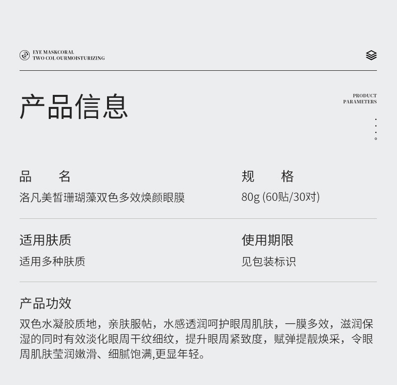 ![]() | Luofan beauty coral algae two-color multi-effect rejuvenating eye mask (mixed two-color) new 80g (60 patches/30 pairs) | ¥3.37 / ≈ 41 ₽ | 49237 | 5650963824746 | |