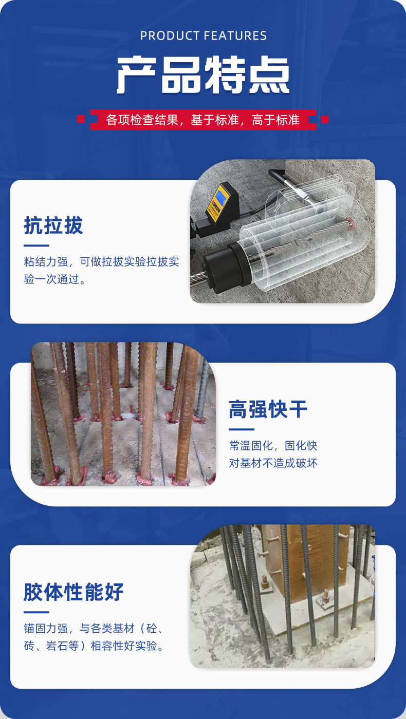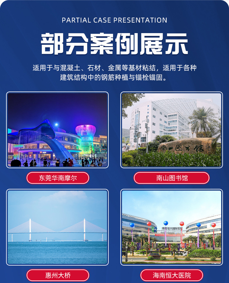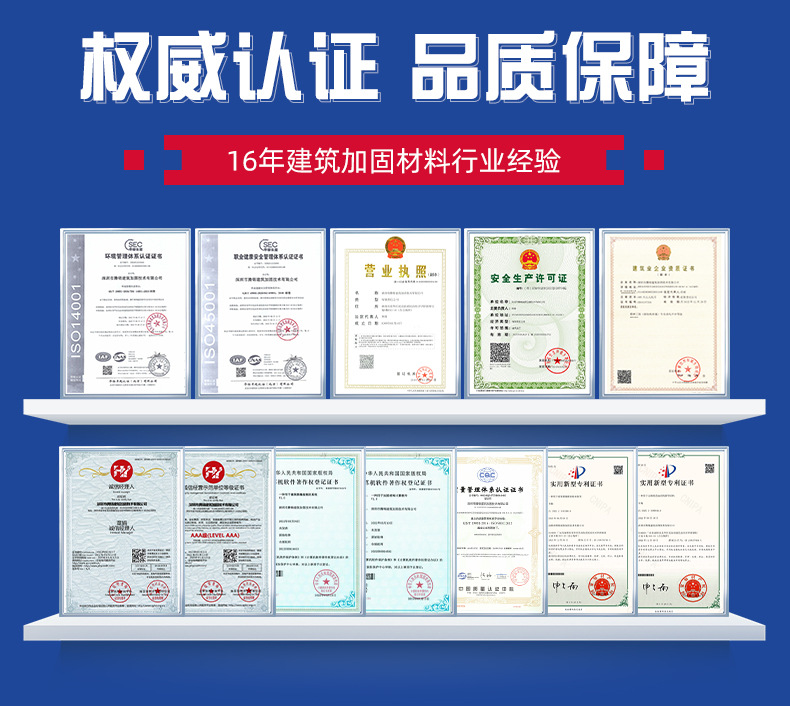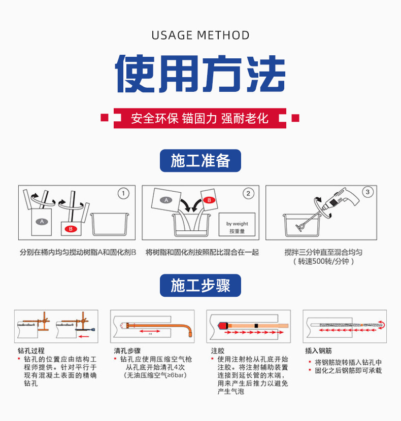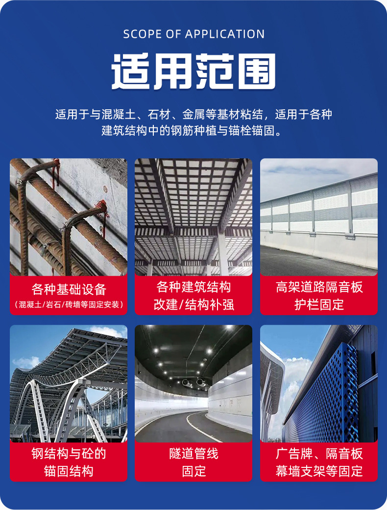 Область применения The concrete components are reinforced with large-area adhesive steel, reinforced with wet steel in concrete structures, and reinforced with concrete cracks or poured adhesive steel.