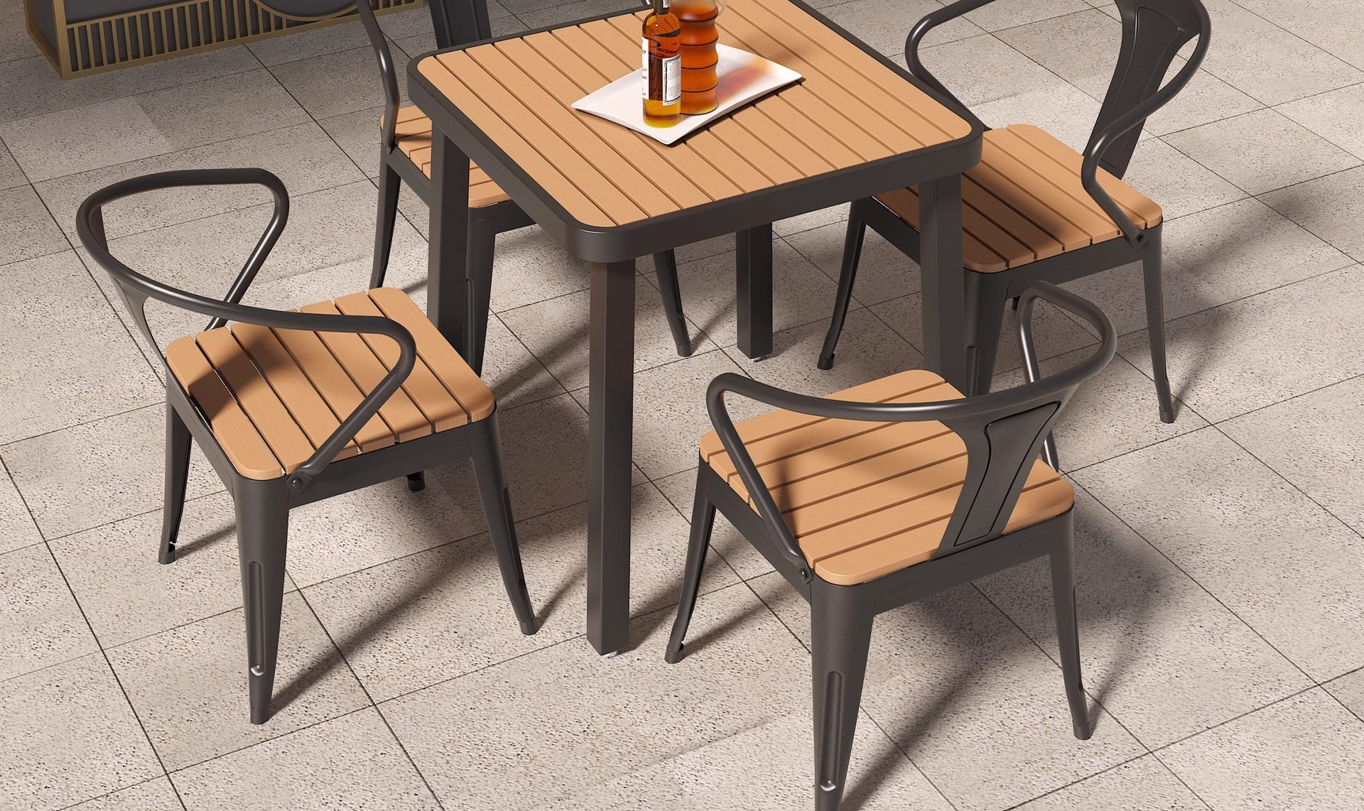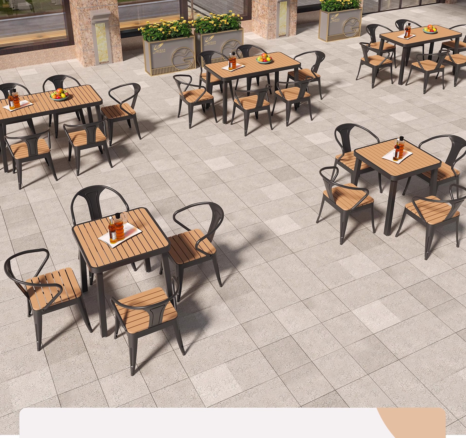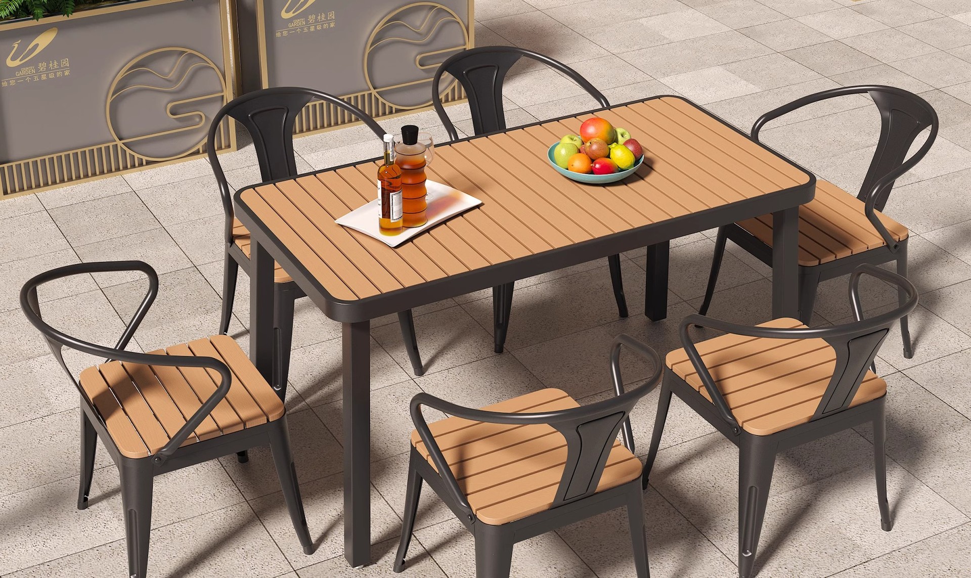 Простые пластиково-деревянные столы и стулья для кафе и рынков
