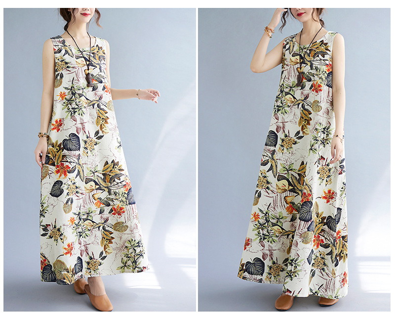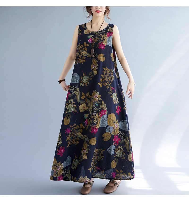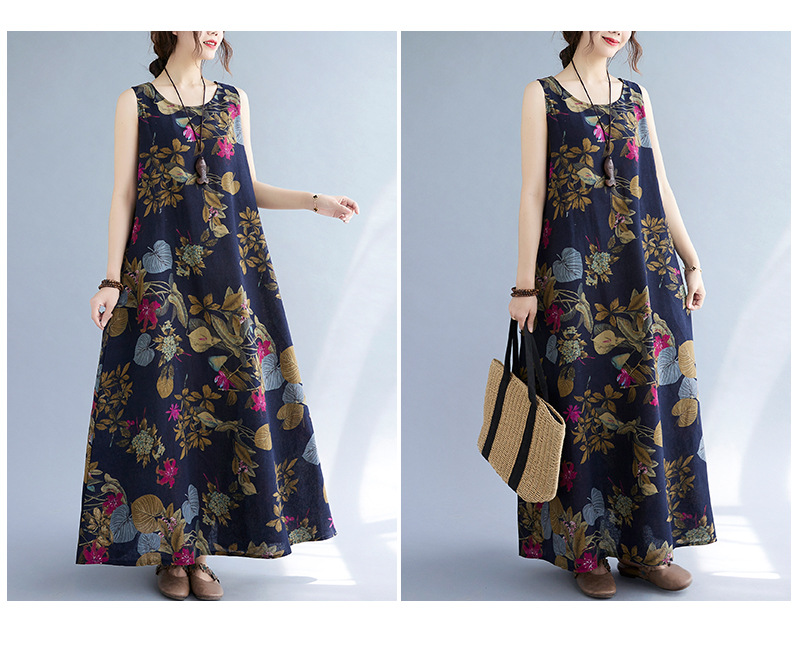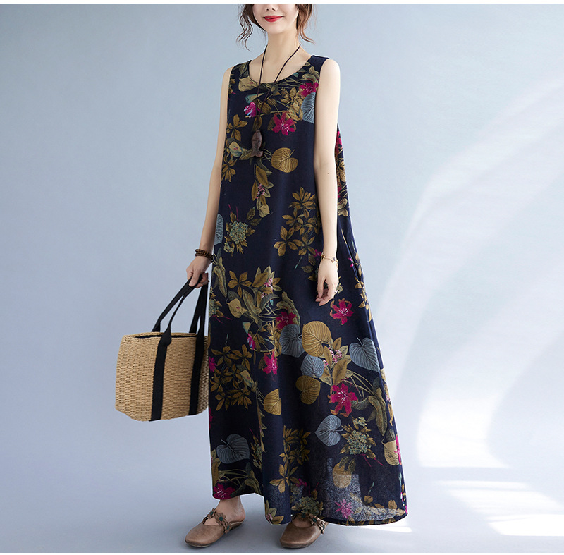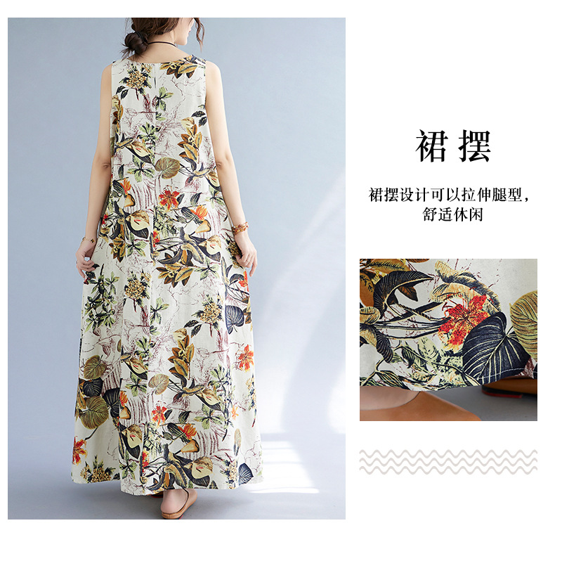 Длинное платье для женщин большого размера летнее винтажное этническое стильное свободное принтованное платье без рукавов из хлопка и льна