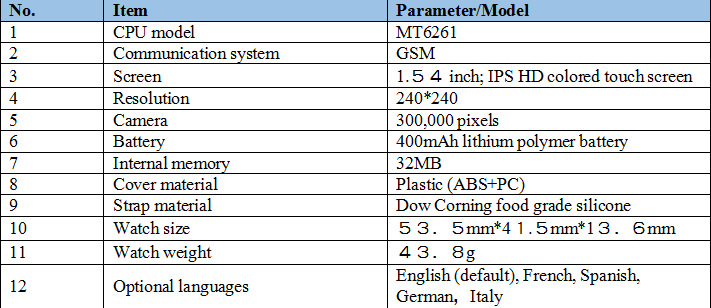 手表功能:拍照,照片大头贴,录制视频,音乐播放,记步,益智游戏24个,手电筒,壁纸更换,五国语言(英语,法语,意大利语,德语,西班牙语)