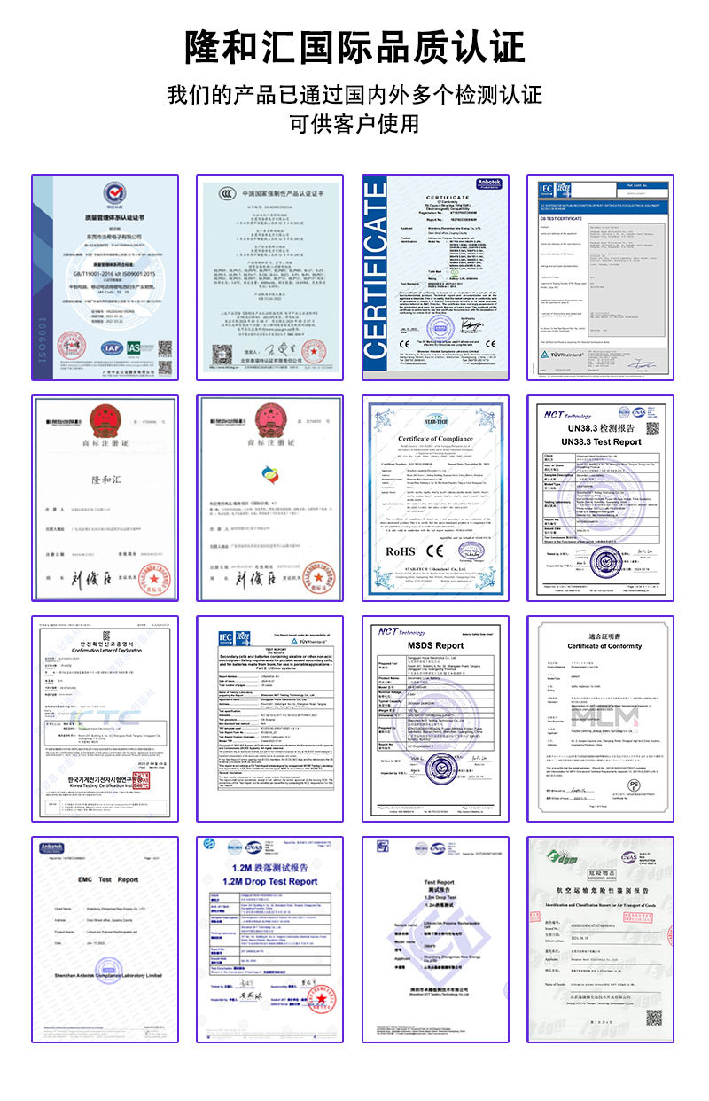 Сертификация продукта ISO9001、UN38.3、MSDS、Rohs、CE PSE