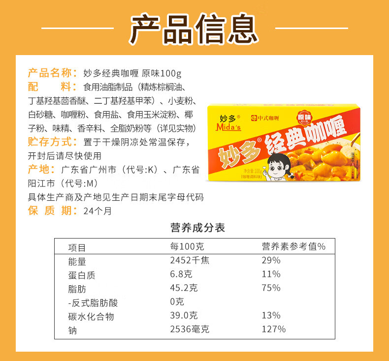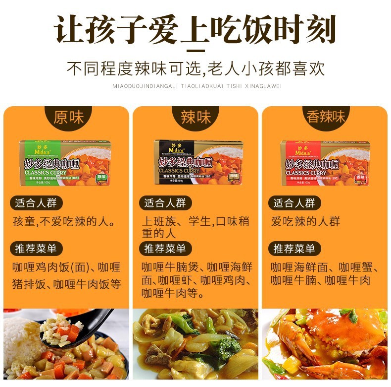 ![]() | [miaoduo] classic curry [original flavor] 100g (single box) | ¥6.39 / ≈ 78 ₽ | 317 | 4814805821913 | |