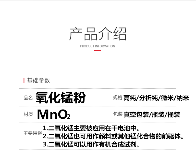 2.电子工业中用以制做磁性材料。炼钢工业中用作铁锰合金的原料,浇铸工业的增热剂。