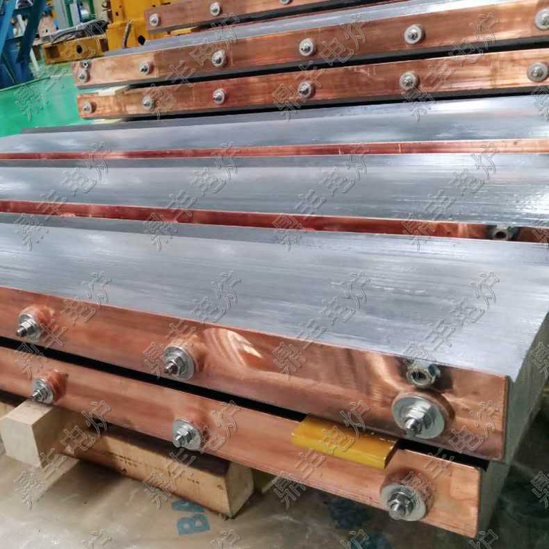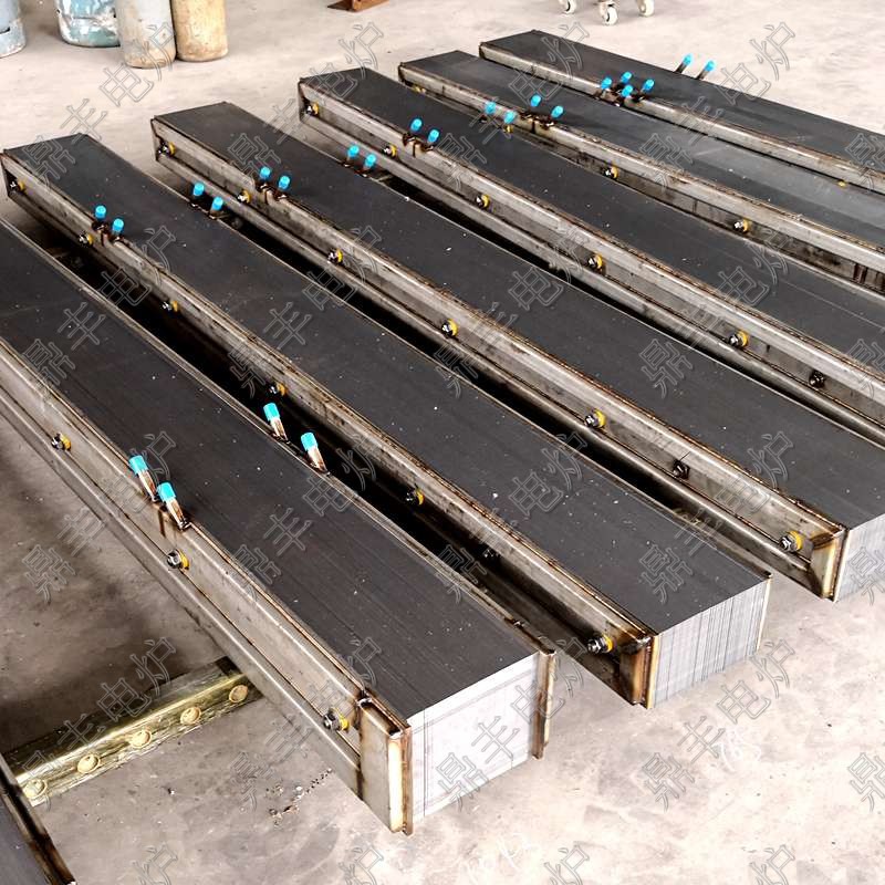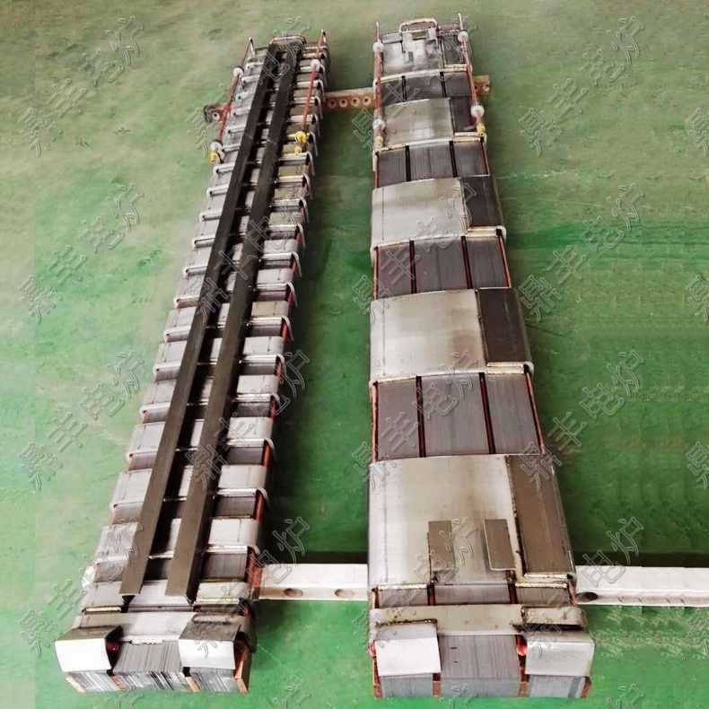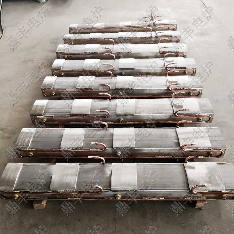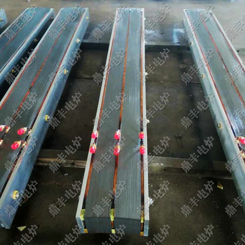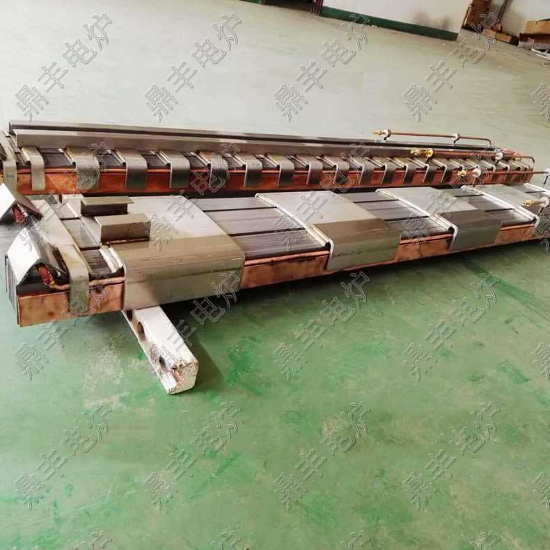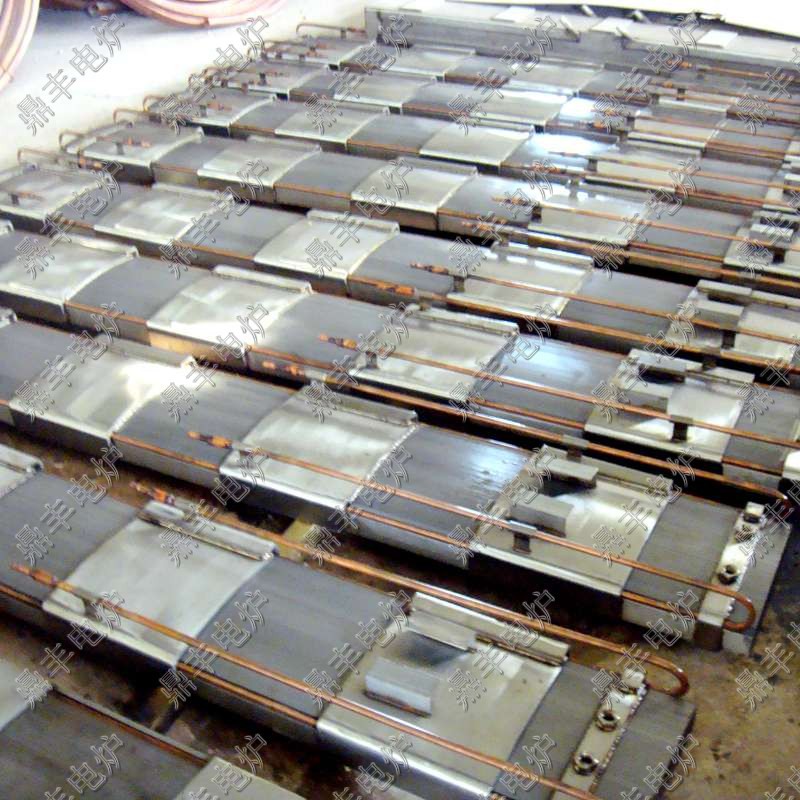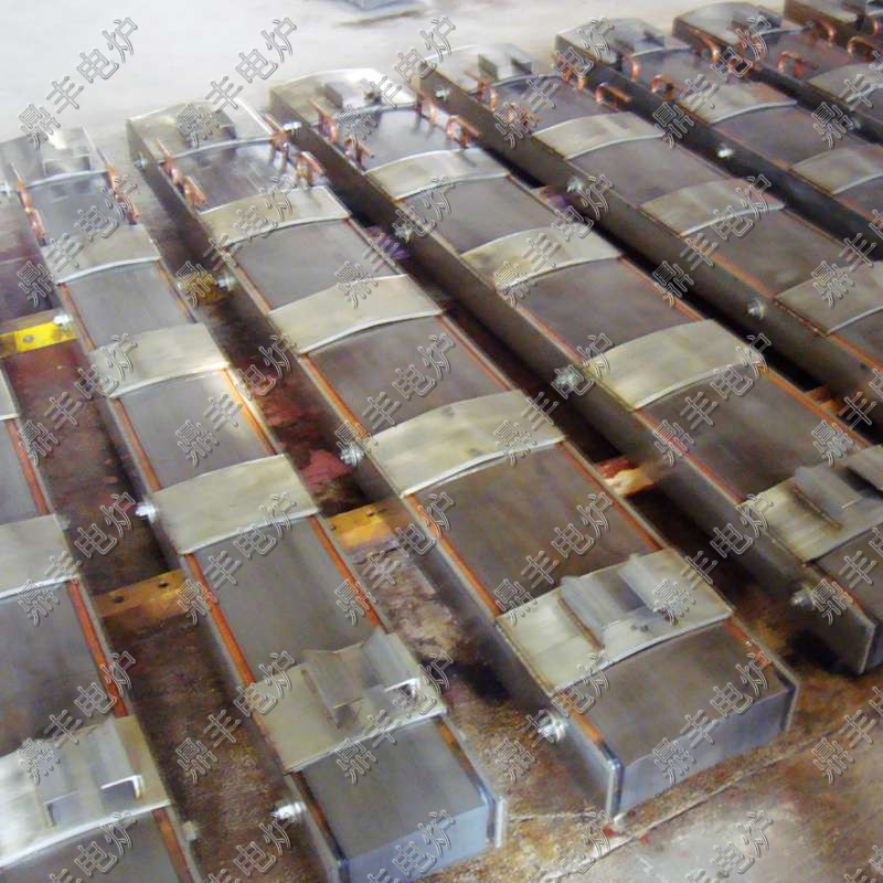 新型W型磁轭(硅钢柱):新型的W结构型磁轭硅钢片采用宝/武钢���新日钢高导磁性冷轧的0.23mm取向硅钢片。能有效避免漏磁的基础上,避免磁轭的温度升高,磁轭(硅钢柱)两边及中间部位采用特制的Tu1铜板/航空铝板隔磁,有效保护矽钢片,硅钢片采用低损耗取向材质,均匀地受力于并轨螺栓,有效的把磁力线聚集到熔池中,防止炉壳发热,提高了系统效率,并对线圈提供最大的压持力,保证了炉衬较长的工作寿命。硅钢片加工后剪切切口飞边允差 ,组装后弯曲度,平行度符合TB/T4280-93要求,保证线圈与硅钢柱圆弧状接触,精密藕合,更加贴紧感应圈,改善硅钢柱磁通走向,消除铁芯在接缝处的局部磁通饱和现象,降低了铁芯的空载损耗、空载电流,充分利用硅钢片的导磁面积,减少中频感应熔炼炉炉体局部发热的可能性。正常熔炼时,磁轭温度保持在50度左右,避免了因为磁轭发热而产生的能耗,因此我们所用的磁轭采用的是不通冷却水的自然风冷结构,如果不发生意外,我们的磁轭终生免维护,这是我们的独家技术。相比于传统结构磁轭,我们的磁轭能耗更低,效率更高,温升更小,噪音更低。鼎丰电炉生产的中频炉磁轭(硅钢柱)在制作及出厂前,严把质量关,为确保硅钢柱制作质量的过程控制,在叠装前对硅钢片各项参数进行了检查,同时每一张硅钢片在叠装前都要经过外观检查,通水槽冷却铜管均通过耐压和通水实验,外层喷涂美国杜邦公司的Dote防电弧绝缘漆,有效的阻止了硅钢片的分切面通磁、生锈保证了磁轭硅钢片的质量。
