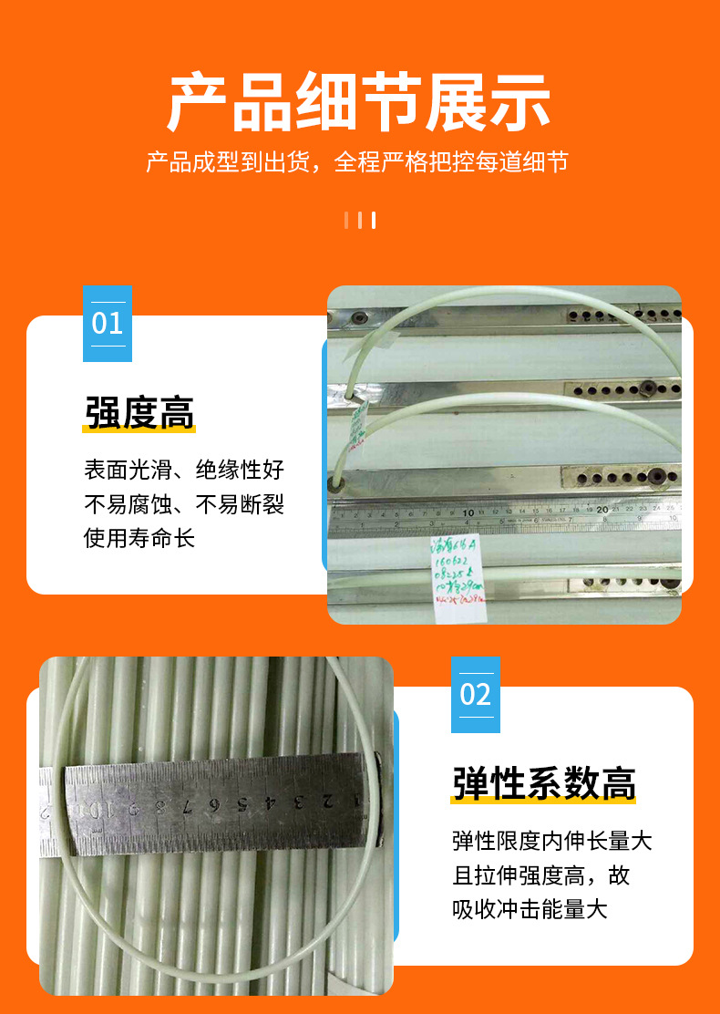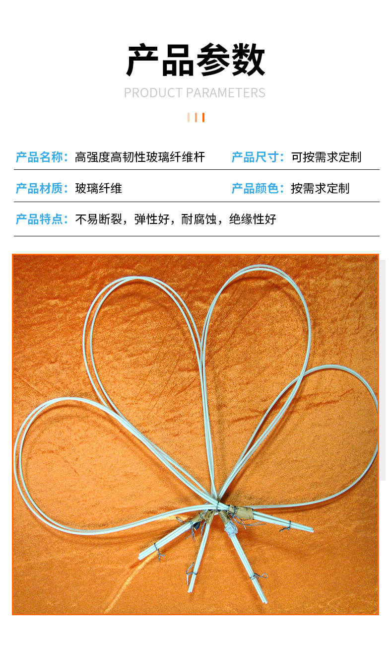 玻璃纤维杆耐高温,不燃,抗腐,耐化学性好,抗拉强度高,伸长小,吸水性小,尺度安定性,耐热性均佳。