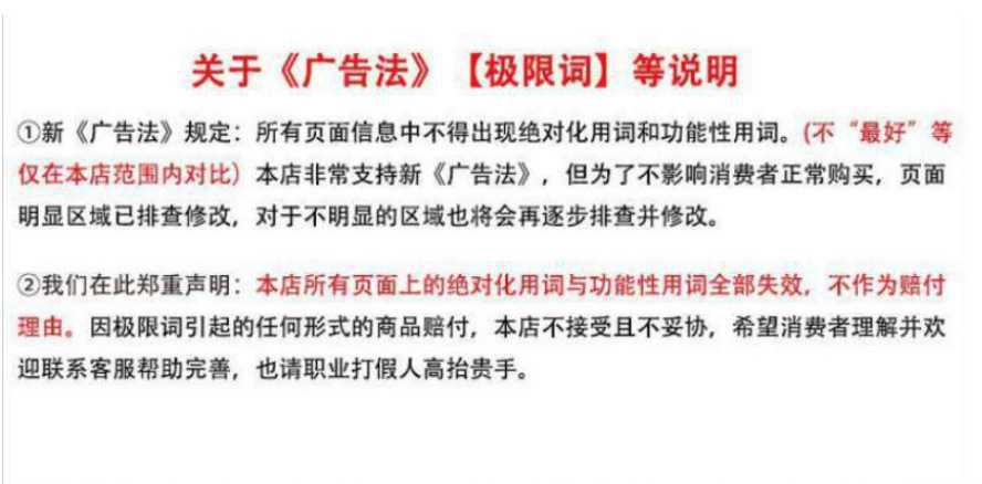 自新广告法出来后,本店秉持对广告法一直的遵守与敬畏之心,对全店违禁词和词做出整改,绝大部分违禁词都已经整改完毕,还有零零星星的违禁词正在整改中。特此申明,本店所有商品标题与详情描述页面中的文字和图片中包含的违禁词与词全部无效,包括但不限于无,零,,,,,……并且这些词不作为赔偿投诉的理由。任何人员均可对本店所有地方的违禁词和词提出建议,联系客服,立马整改。在未与我方联系的情况下或者联系了我方,我方未整改的前提下,投诉到工商局的情况均视为无效。谢谢!