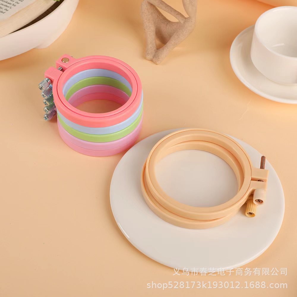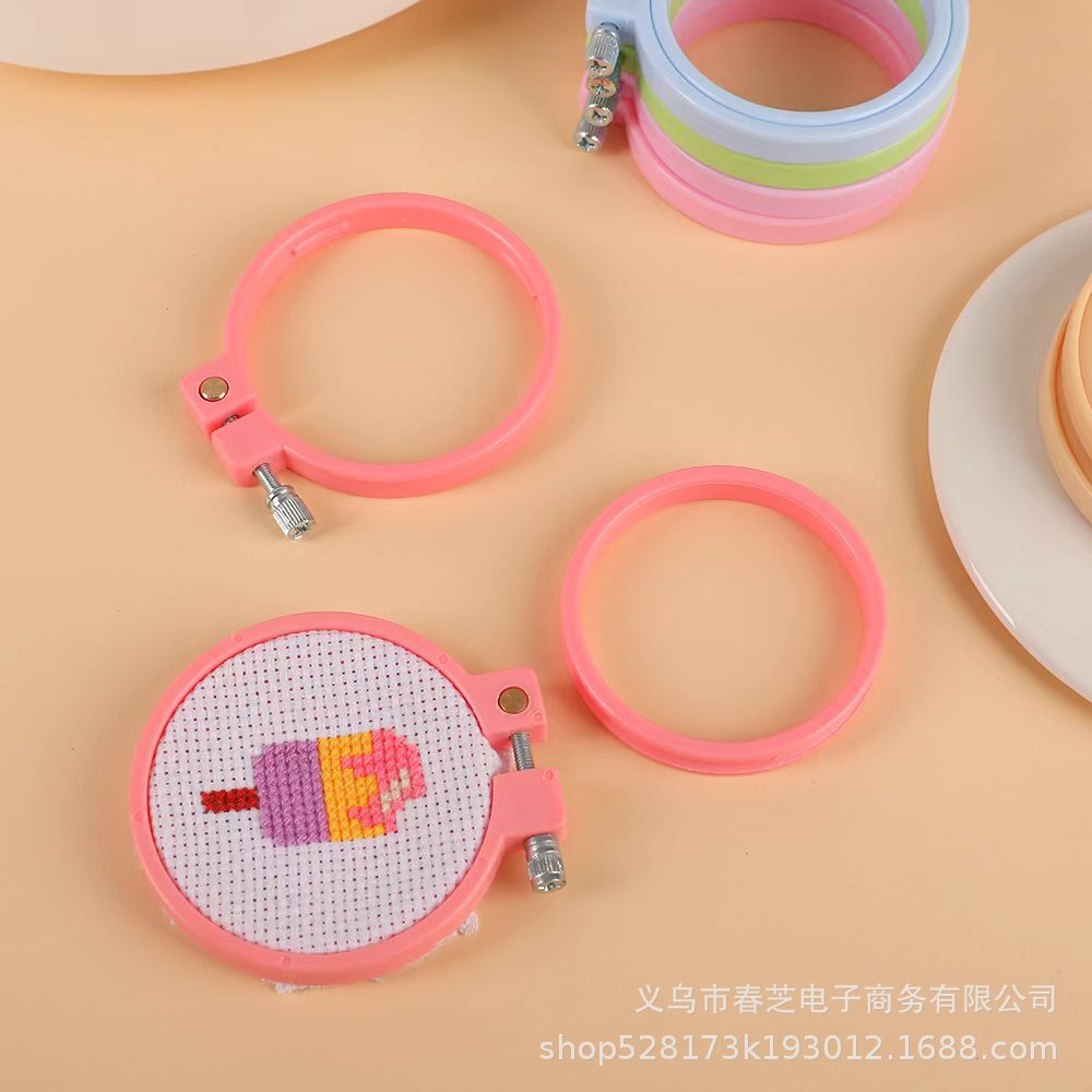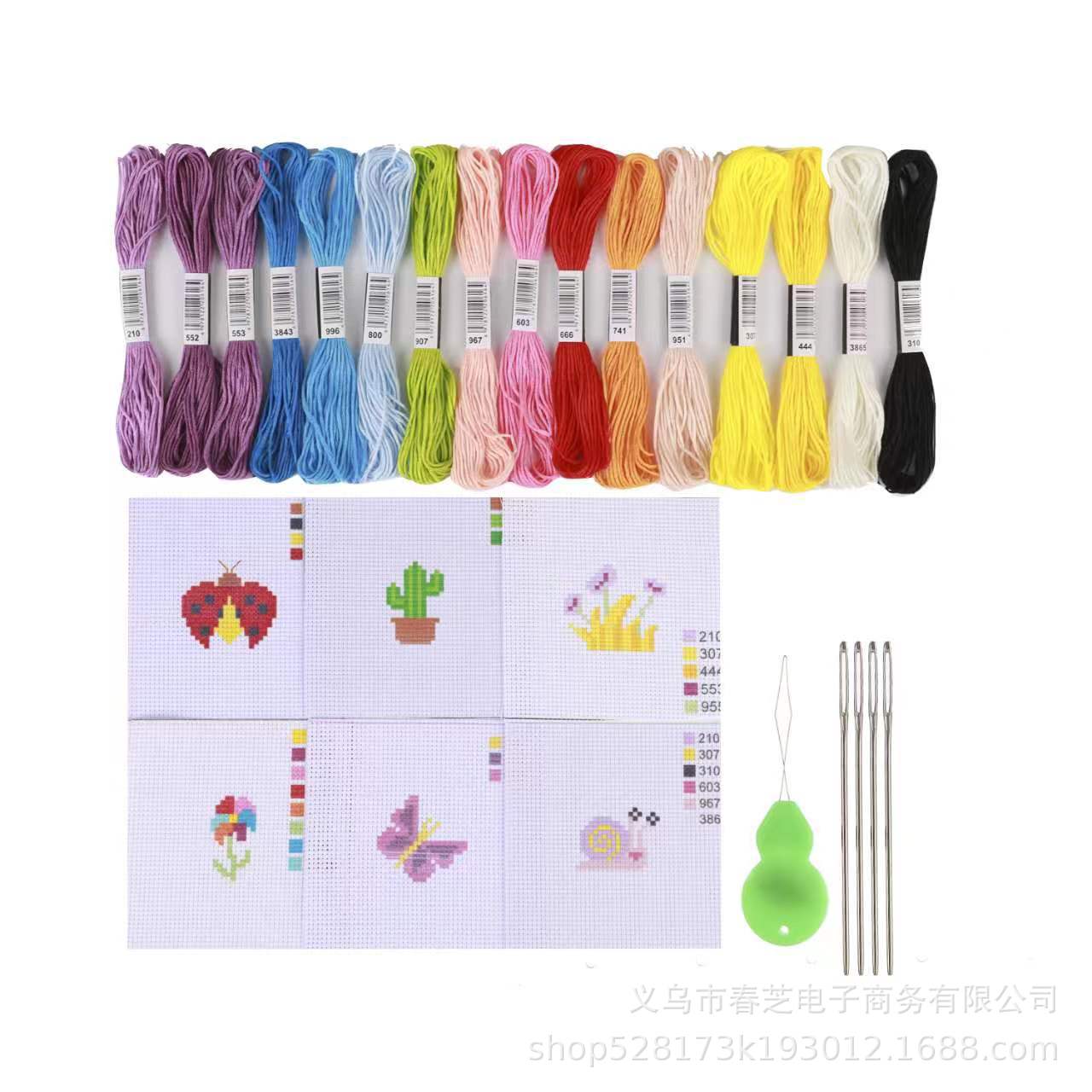 组合套装材料包含:6款图案的绣布,2个9cm的防竹绣绷,6枚绣花针,1个穿线器(颜色随机),充足的绣线,说明书1张
