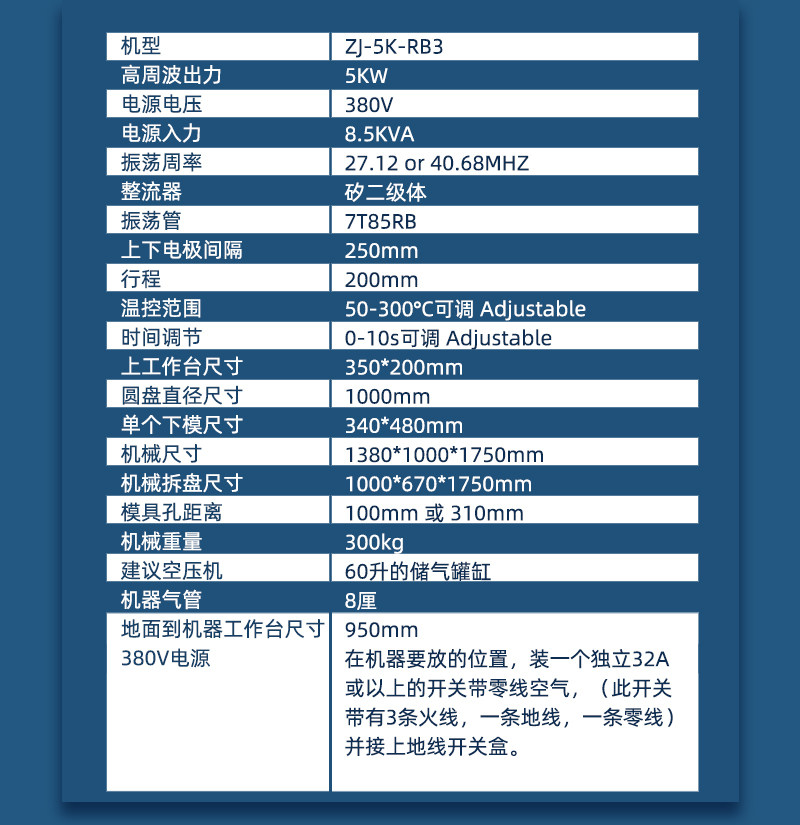 1.型号为ZJ-5K-RB3,此机装有进口双管子防火花保护装置,对高周波模具及生产产品起到很大的保护作用,可以把模具打火机率降低到90%,