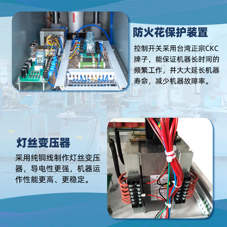 1.高灵敏度进口双管防火花保护装置,能有效保护模具及产品之缺损,从而大大减少烧坏模具机率,采用国际大品牌原装OMROM(欧姆龙)继电器及台湾正宗CKC时间制,能保证机器长时间的频率工作,并大大延长机器寿命,减少机器故障。
