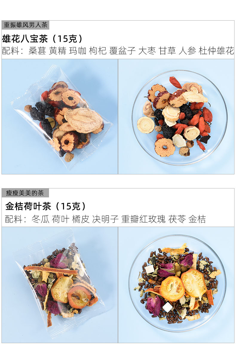 配料:冬瓜丁 荷叶 橘皮 决明子 重瓣红玫瑰 茯苓 金桔