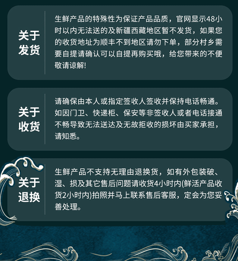 因冻货特殊性,请在货品发出前确认收货地址和电话是否正确,保持电话畅通,及时收货冷冻保存,发货后由于买家个人原因造成货品出现问题,责任由买家个人承担!
