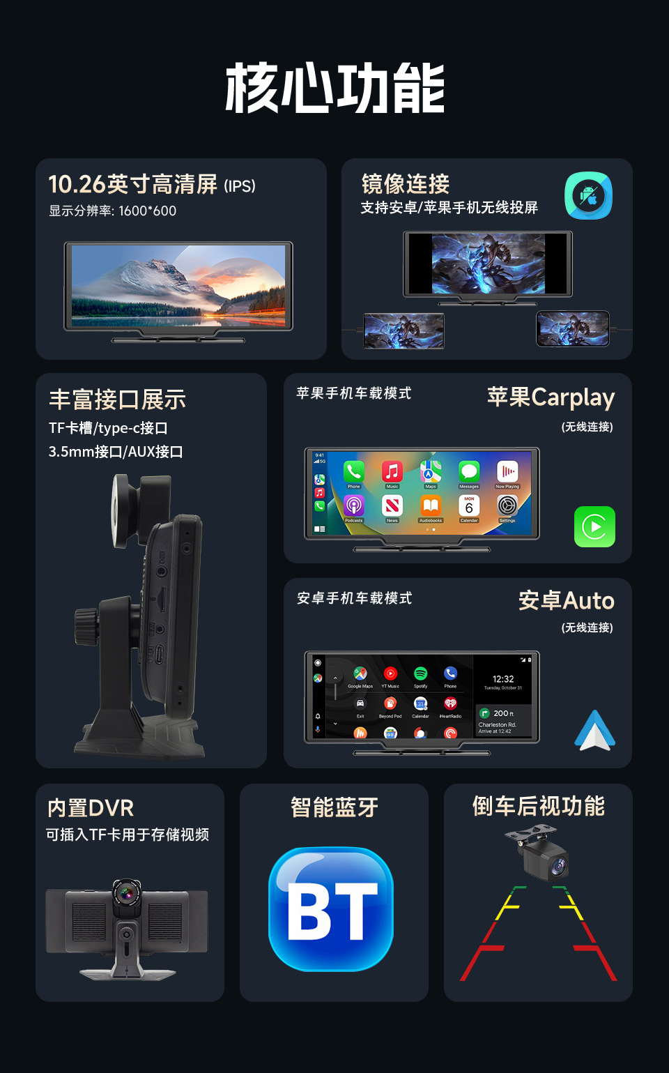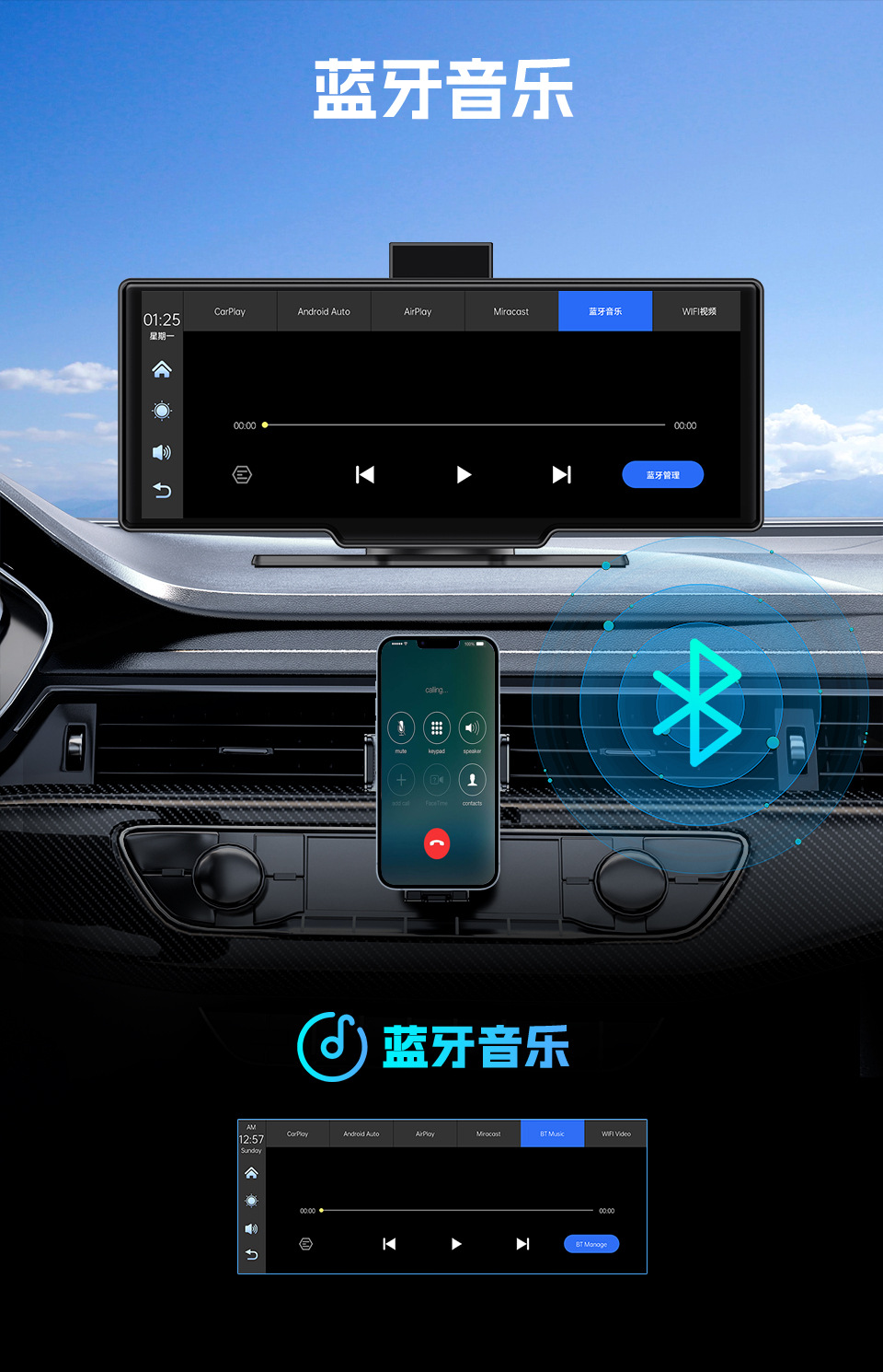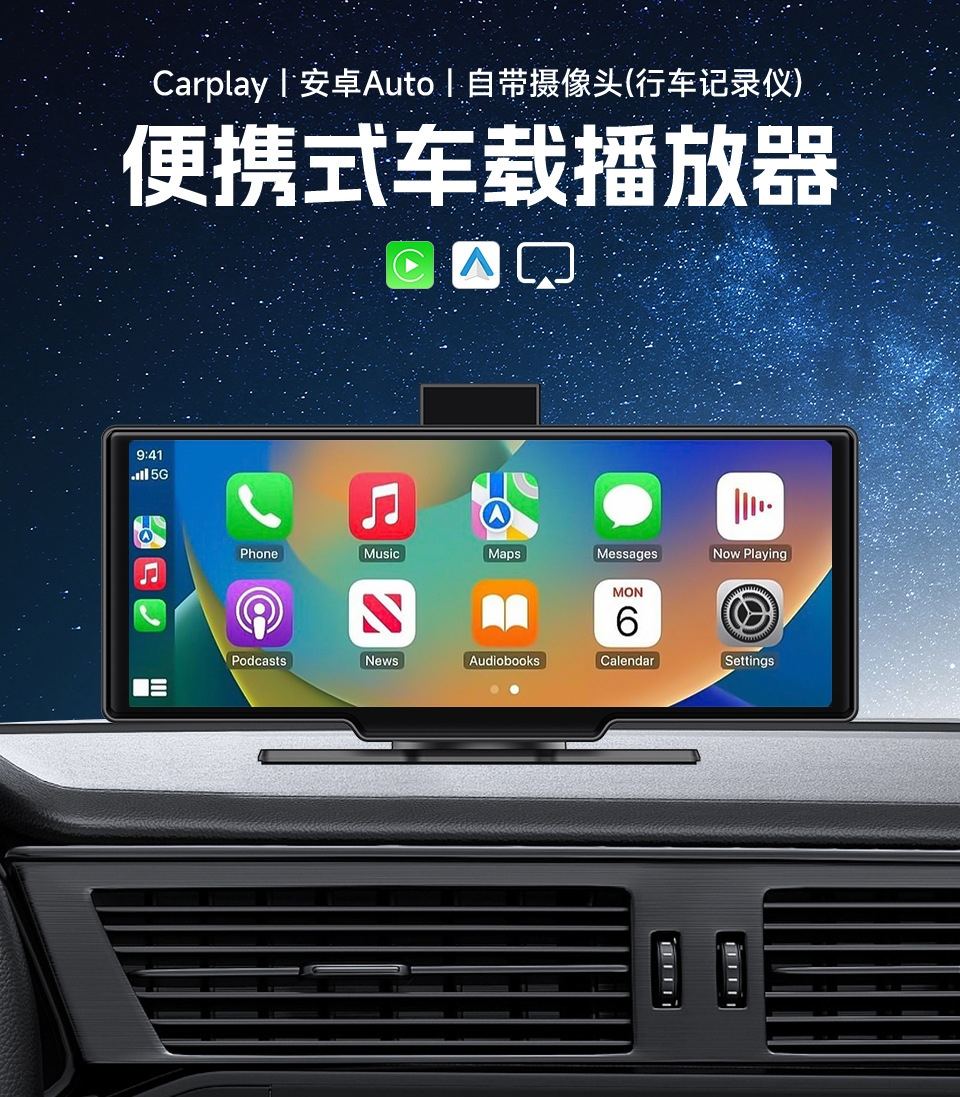 10.26-дюймовый портативный беспроводной Carplay с видеорегистратором, Bluetooth MP5 плеер