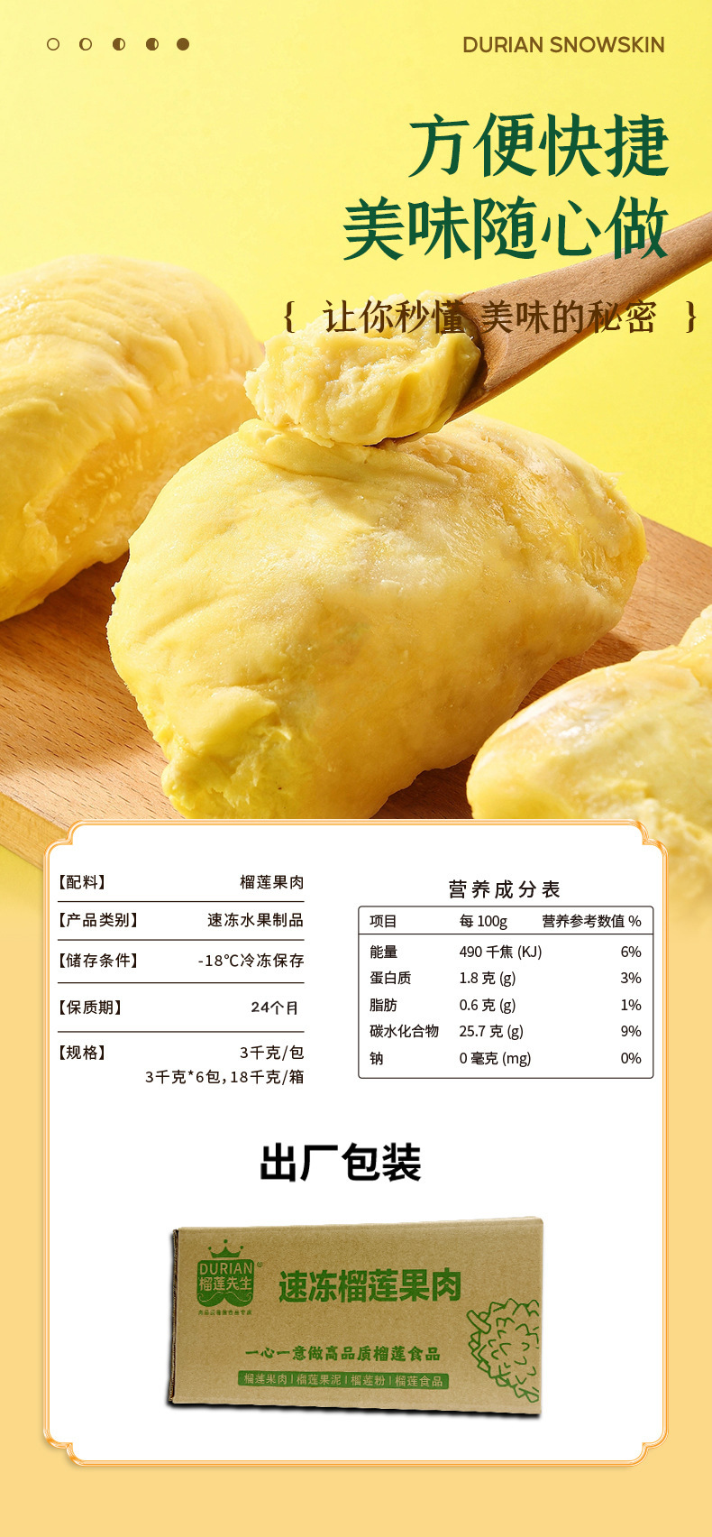 Дуриан без семян высшего сорта, тайский дуриан Golden Pillow, быстро замороженная мякоть 18кг/коробка