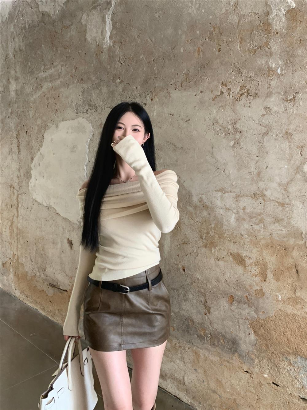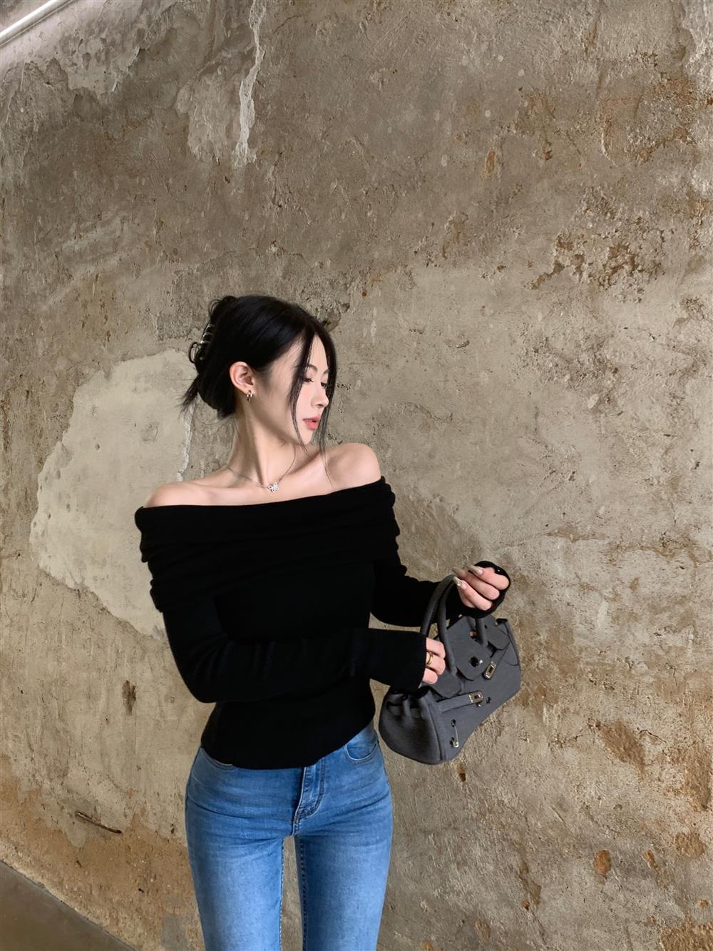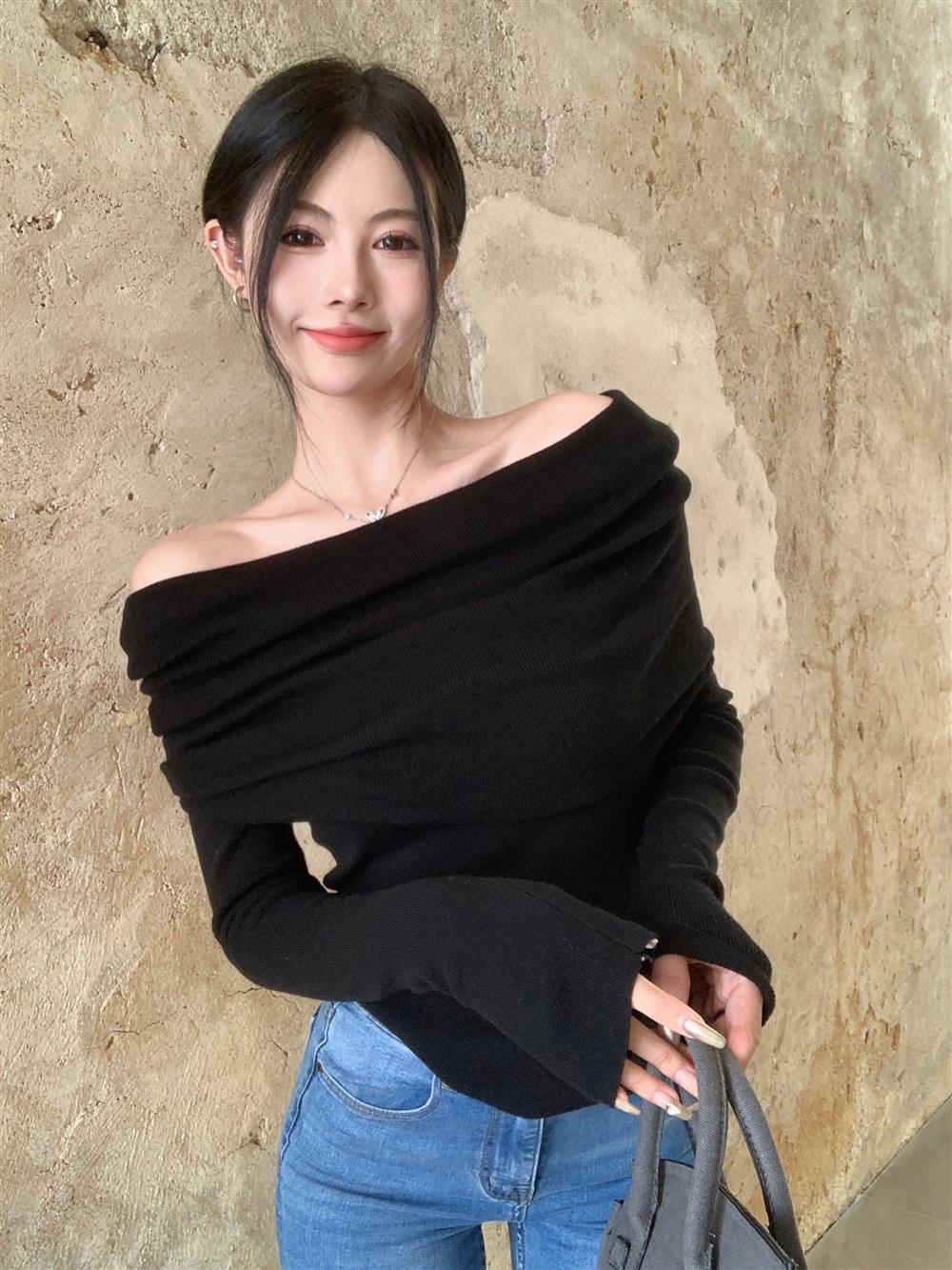 Теплый свитер с открытыми плечами и воротником, короткий, в нежном стиле, облегающий, с длинными рукавами, базовая футболка
