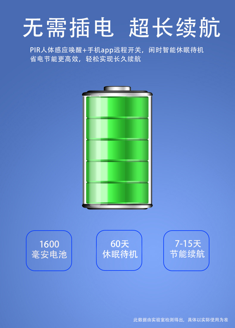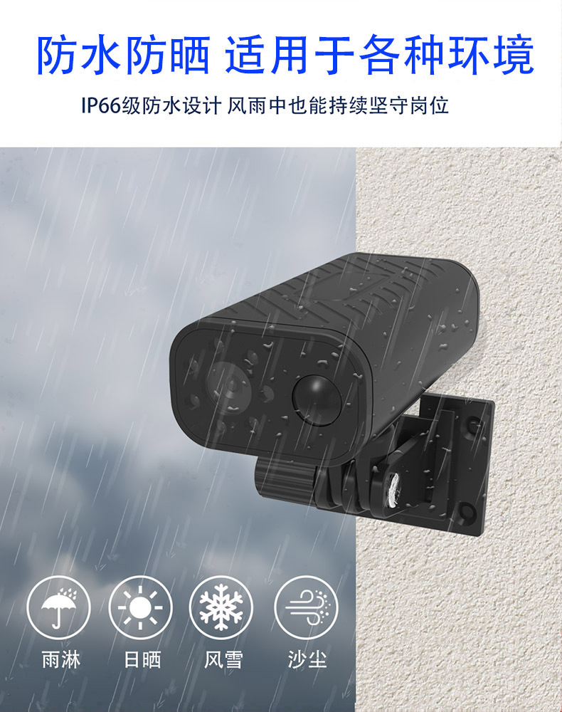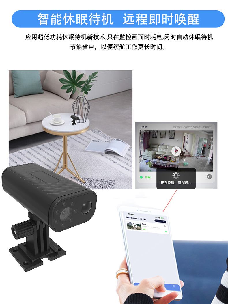 新上市低功耗无线摄像机,超清画质,IP66级防水,支持休眠待机,手机app远程唤醒和人体感应唤醒,内置电池充满可以休眠待机15天以上,也可关闭休眠模式常规模式工作。