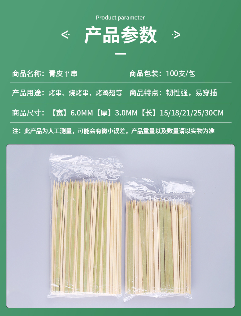 📦 | 18cm long [100 pcs/pack]] | Green leather flat skewers [thickness 3.0mm*width 5.0mm] | ¥4.95 / ≈ 60 ₽ | 99989 | 5997873047617 |