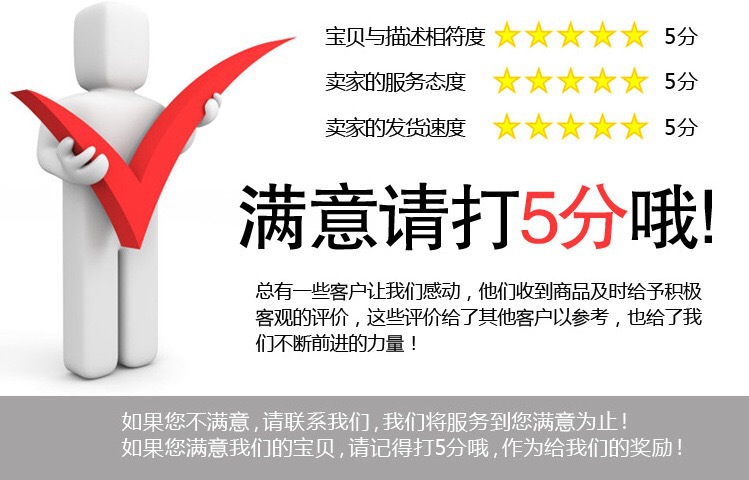 我司一直秉承客户至上的原则,以客户体验为中心,公司的发展离不开广大客户的支持,所以如果亲们在收到货物时,发现有质量上的问题请及时与我司联系退换货,让我们一起解决购物中产生的问题。