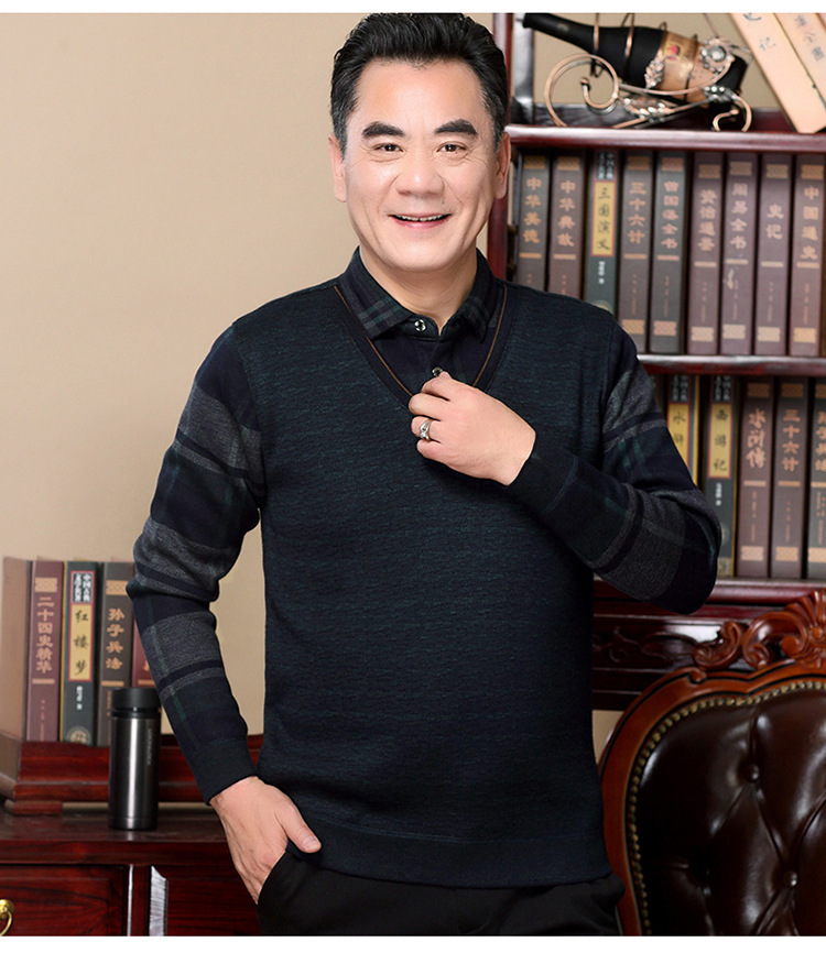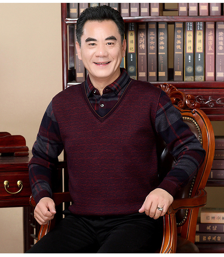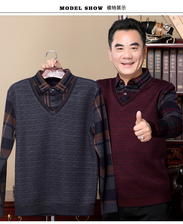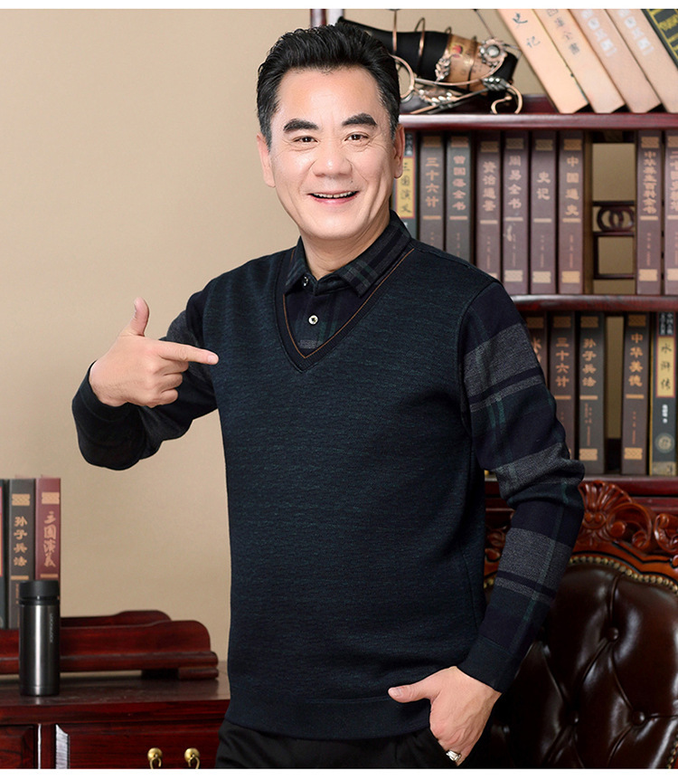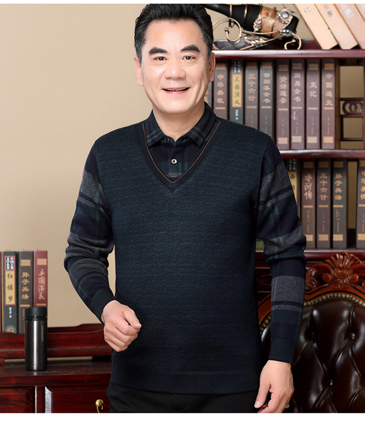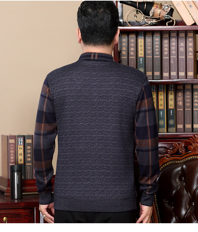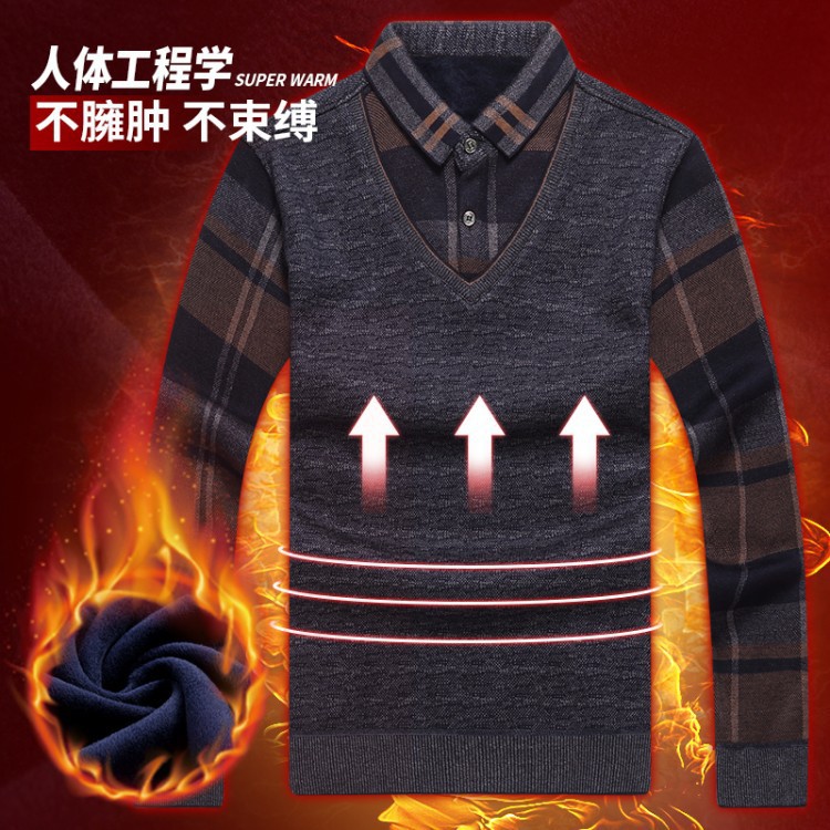 Теплый свитер для мужчин среднего возраста с утеплителем, фальшивый комплект, зимняя вязаная одежда
