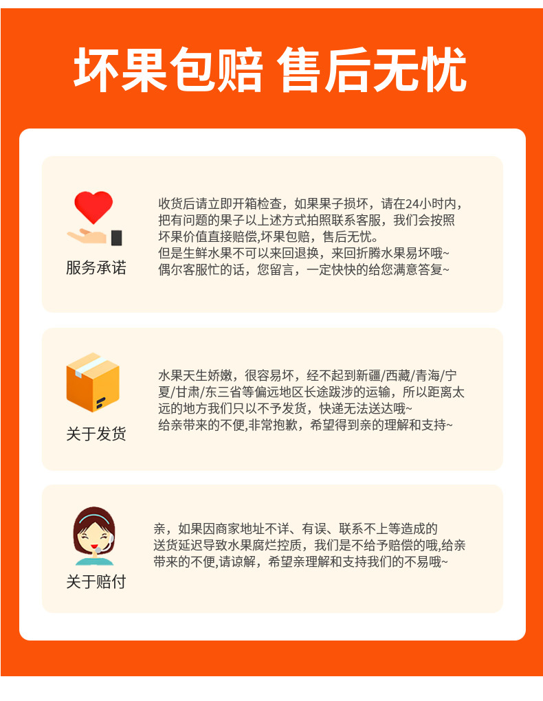 1.签收后24小时内开箱验货,如发现有坏果立即拍照联系我们作为赔付依据,要求正规坏果照片(坏果+包装箱+快递单号)放一起拍照,
