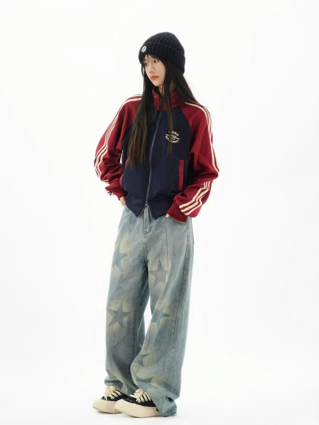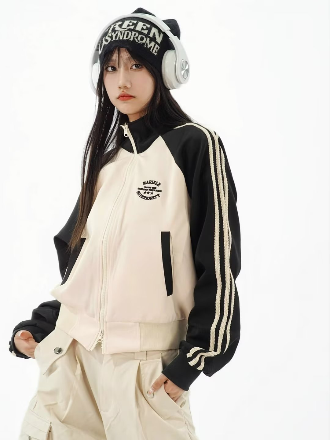 Американский ретро преппи стиль короткий кардиган на молнии для девушек с полосатым цветовым сочетанием и стоячим воротником, повседневная куртка с длинными рукавами