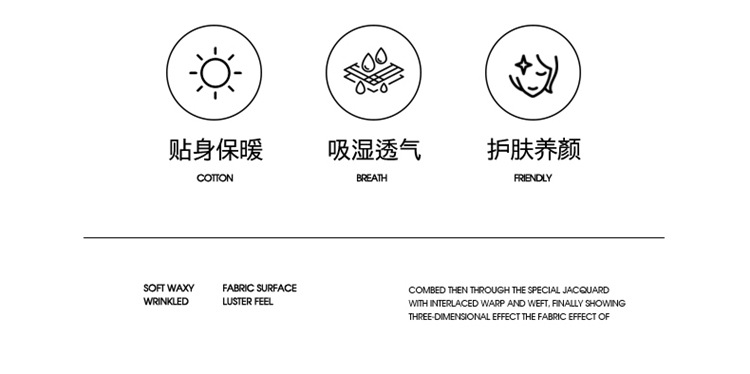 关于产品洗涤:常规洗涤即可。如用高浓度洗涤剂请先加水稀释,再把套件浸入。不要用热水洗涤,如含有漂白成分的洗涤剂可能会造成产品褪色,因不当洗涤,晾晒造成的破损,污渍,褪色将不作为退换理由。