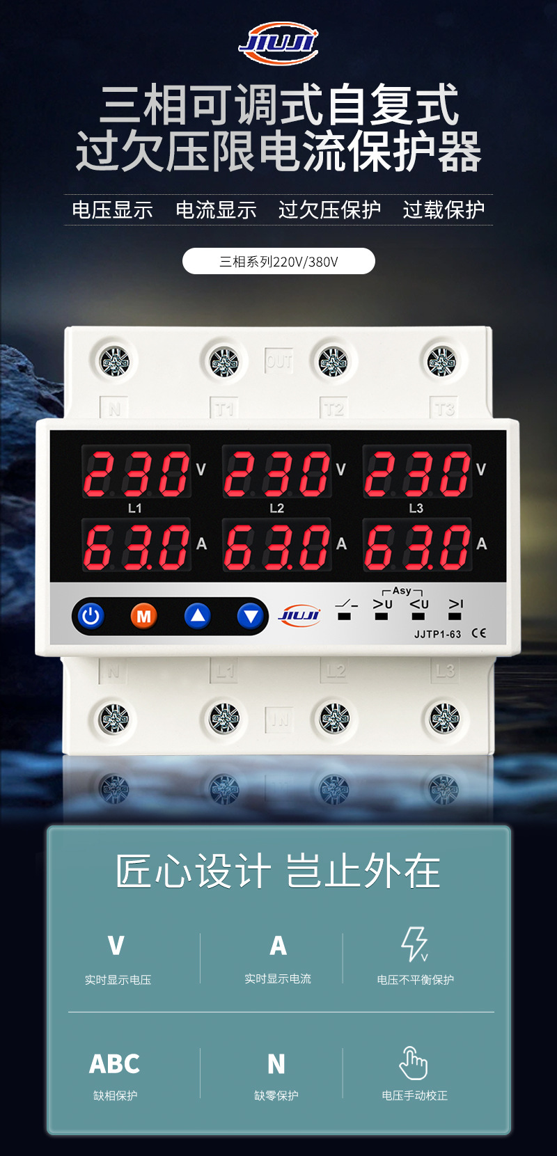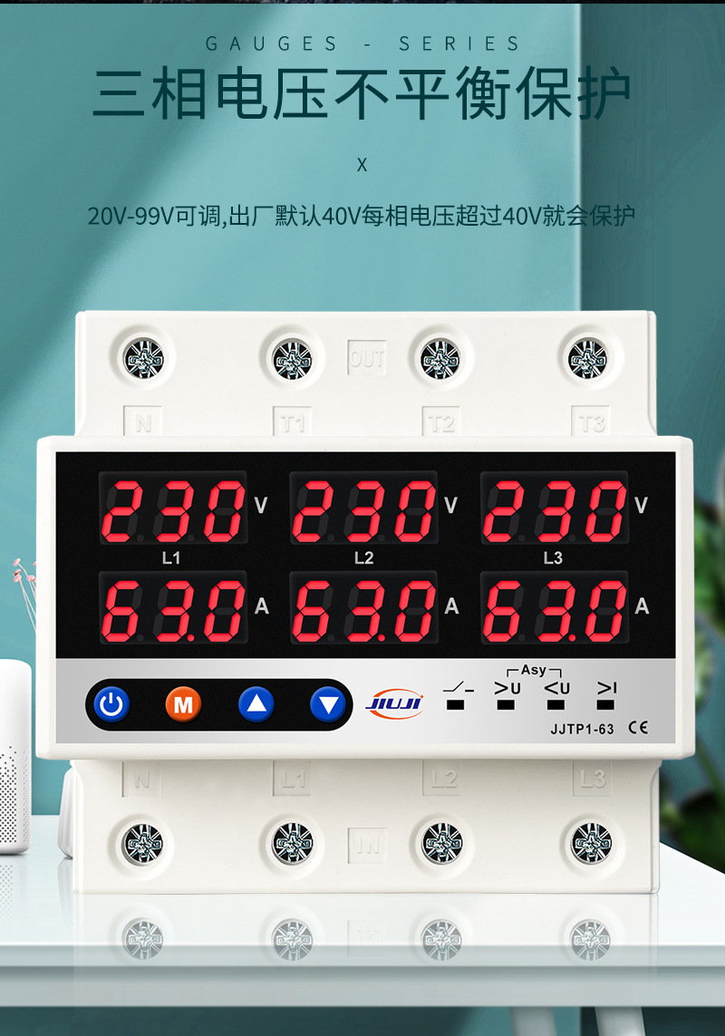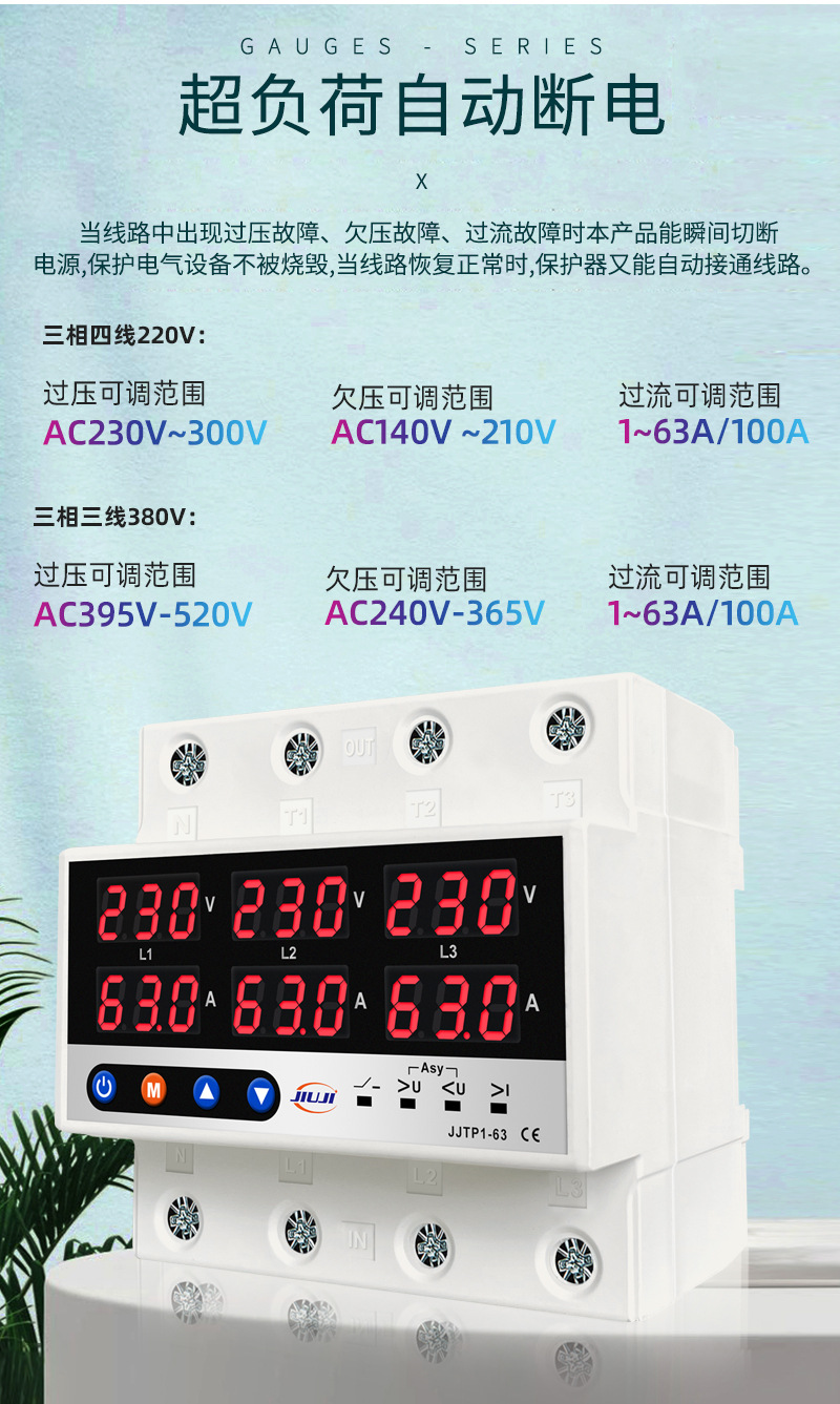 Трехфазный регулируемый цифровой дисплей, самодуплексный защитник от перенапряжения, 63A 380V
